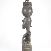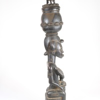A sculpture depicts a seated maternity receptacle with a lid that features an equestrian figure. A seated female figure shows various scarifications on her breasts, where a baby is suckling to sustain his vitality. A line of a conch shell decorates the surface of a receptacle vessel. All these detailed elements are symbols of fertility. Although Senufo society is patriarchal, inheritance passes through the matrilineal line. The importance of maternity is generally reflected in the sculpture's content.