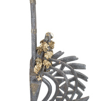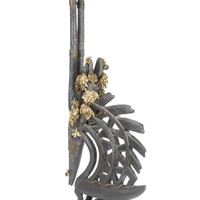 The headress resembles the form of an antelope, pangolin, and aardvark referring to the mythic Ci-Wara figure. Ci-Wara is believed to have introduced humans to the practice of agriculture. During ceremonies celebrating the skills of successful farmers, two headdresses, one male and one female, are worn. The inclusion of both male and female Ci-Wara headdresses symbolizes the unity between men and women as a key part in maintaining a strong community. This headress depicts the female figure with a smaller, child figure standing on its back. The headress is carved of wood, and has small metal bells that would have chimed during the performances. Cowrie shells and small pieces of fabric adorn the figures faces. Both faces are highly detailed and narrow. The bodies are more simplistic and rest on short legs. The mother and child figure create an interesting play of positive and negative space through their silhouette forms.