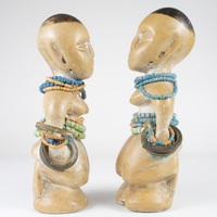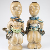 The wooden carved female twin figures are highly decorated with dark pigments, glass beads and metal jewelry. The bodies are rounded, kneeling with their arms at their sides. The eyes are closed with thinly incised lines marking the eyelids. Scarification patterns run vertically up and down the cheeks. Twin figures were created to commemorate either one child or the set of twins after death. Twins are believed to have spiritual powers in communities of Nigeria like Yoruba, thus memorial figures were often created.