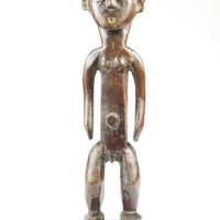 The standing male figure is carved of wood with a dark patina. The head is proportionately larger than the body and topped with a stylized coiffure. Ears have been carved on either side of the head in line with bulging eyes and a centered nose. The mouth is square in juxtaposition with the rounded forms of the other features. Above the eyes on the brow ridge are small holes indicating scarification patterns. Arms reach downward towards thicker, short legs. The abdomen is long and narrow, with carved breasts and male genitalia, along with a protruding navel.