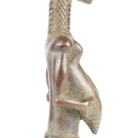 The carved wooden female ancestor or power figure is highly decorated with scarification patterns and incised lines marking the collar necklace and loin cloth. The figure may be a representation of the "Mupaki wa manga" power figure, protecting from and controlling otherworldly forces.