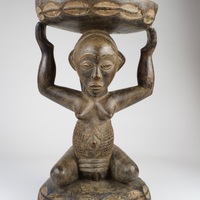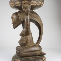 The carved wooden stool has clear characteristics of the Luba style, such as the facial features and seated position. The figure is female with a round abdomen and pronounced navel, decorated with scarification patterns. The base of the stool and round seat supported by the figures arms are decorated with a wrapping pattern depicting cowrie shells. The stool has a functional construction however it was most likely used for decorative reasons, or as a metaphorical seat of kingship for the Luba leadership.