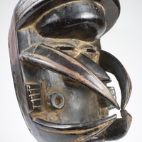 The Gere mask is carved of wood with a thick, dark patina. The forehead bulges forward, with a thin central division. The eyes are formed by narrow horizontal openings under the forehead. The nose and mouth extend forward with sharp angles to compliment the four horns that round inward to the center of the mask. on either side of the face, under the nose, are small holes alongside horizontally incised lines.