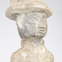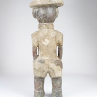 The small, standing colonial figure represents the influence of the European settlers in the Baule area in the early 20th century. The figure is painted to reflect the aesthetics of European attire, such as the large white hat. It was common practice for small standing figures to be made as "spirit lovers", or an ideal vision of a spouse. It is possible that the small colonial figure was created as a spirit lover, that reflected the new societal ideals introduced by the Europeans.