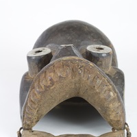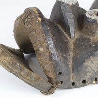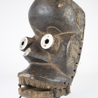 Carved wooden mask, with hinging jaw and round iron forms to represent eyes. The forehead and the upper jaw protrude, to create exaggerated features. The Dan mask may be associated with forest spirits, manifesting their powers. This mask can be grouped into the 11 major types of figures used to represent varying social topics such as education, politics and entertainment.