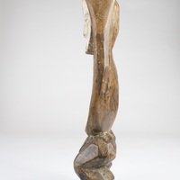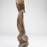 Wooden standing male figure with white kaolin, heart-shaped face. The figure has one arm extended upward and the other appears to have been excluded from the design intentionally.The central abdomen is flat, carved into a board like shape. When used in ceremonies, the figure may have small holes carved into the abdomen. This object would have been within one of two baskets among other wooden figures for initiation ceremonies.