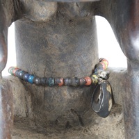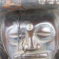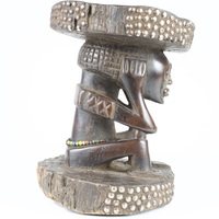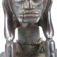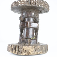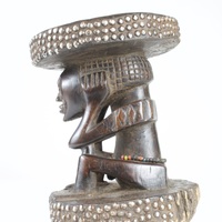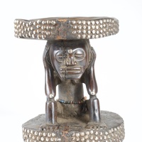 The Luba stool is carved of wood, with metal pins lining the base and seat. Thin sheets of metal can be seen on the base of the stool and on the seat in line with the front of the figure. These metal sheets may have been used to repair cracks in the wood. The figure is seated with its elbows resting on its knees, and hands cuffing around the ears. Female genitalia can be seen on the figure, along with colorful glass beads wrapping around the waist. They elbows and glabella have been decorated with metal pins. The face of the figure has a horizontal emphasis, with narrow eyes and a thin, wide mouth. This highly decorated Luba stool was most likely used by those in leadership roles. Stools of such a style were often used as decoration, however this stool appears to have some wear as noted by the metal sheets.