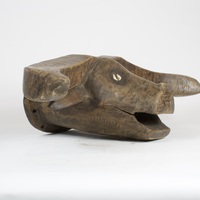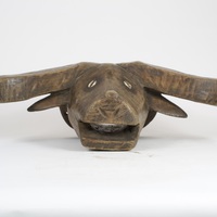 Kiyunde (buffalo) mask with elongated horns flaring out on both sides and a squared-off snout with shell eyes. It represents the male wild buffalo and is connected to ideas of strength, leadership, and cultural heroes.