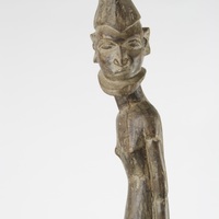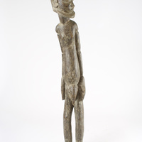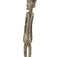 The male figure is carved from one piece of wood, as if stemming from the rounded base beneath its feet. The figure is thin with a vertical emphasis. Common characteristics of Dogon sculpture can be seen through the bend in the knees and the turned head. Carved statues such as the one pictured were often ancestral figures placed on altars.