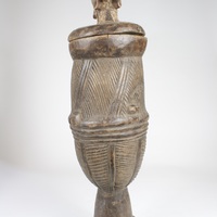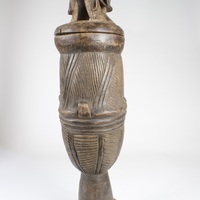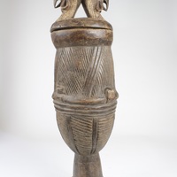 The large vessel is carved of wood with a dark patina, along with red pigment and white kaolin on the surface. Thinly incised lines cover the surface of the vessel creating intricate patterns. The lid has two busts of a chicken on either side of a cylindrical handle. The chicken may be in reference to animal sacrifice, as the killing of the chicken during rituals was commonly understood to protect from illness and other troubles.