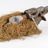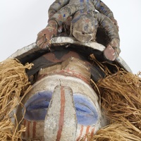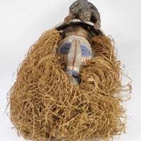The Yaka "kholuka" mask is carved of wood with raffia surrounding the head. The nose is turned upward, the mouth is open with individually articulated teeth, and the face is brightly painted creating an expressive image. This facial construction is used to depict Yaka sexualtiy and spirituality. Atop the head is lizard constructed of tightly joined fabric pieces, covered in pigment of similar coloration to the face. The mask is representative of those used during initiation rituals like the "n-khanda" ceremony marking the transition from boy to man.