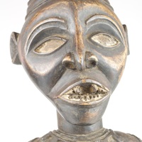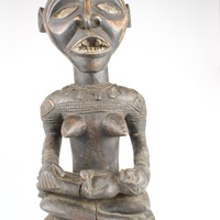 The commemorative, seated mother and child figure is a common archetype of feminine beauty in Kongo history. The mother sits, cross-legged with a small child across her lap. The proportions are exaggerated, as the mother figures head is enlarged in comparison to the rest of the body. Though hollow, the eyes may have had inlaid glass. Eyes made of glass would indicate the commemorative role of the sculpture, as the reflective quality of the material serves as a connection to the ancestral realm. The teeth are filed and shaped along the top and bottom lips, and the nostrils flare outwards. The elaborate coiffure atop the mothers head indicates a woman of elite status. Spanning across the figures shoulders and chest are scarification patterns carved at a high relief. The child figure is less detailed, laying on its back with its arms placed over its torso.