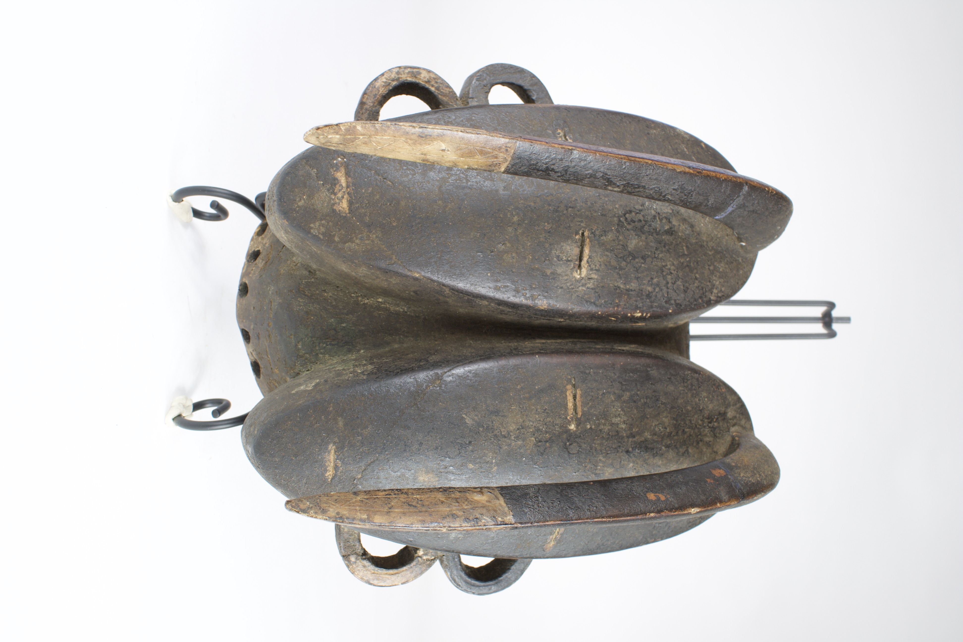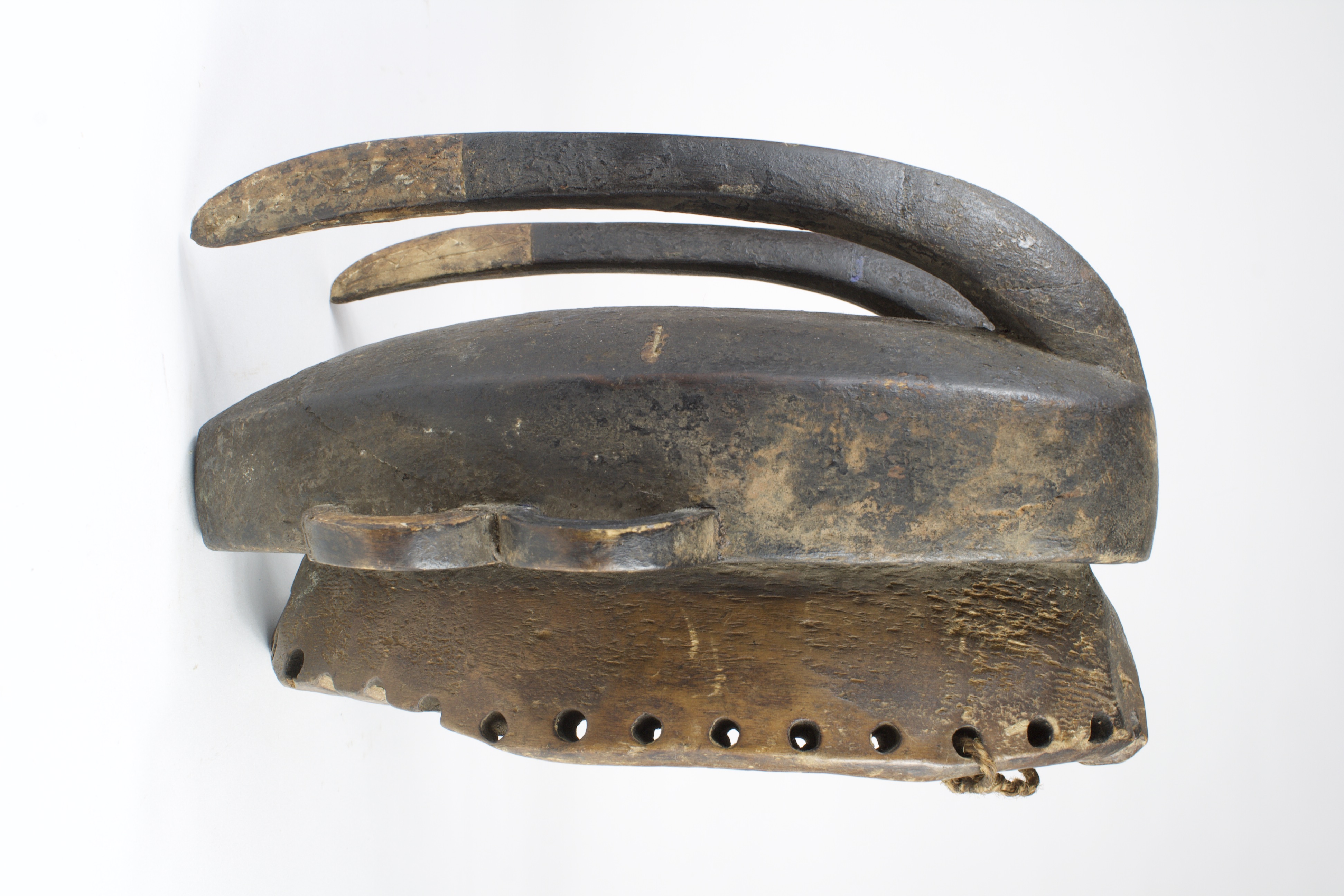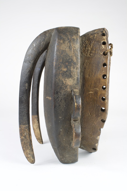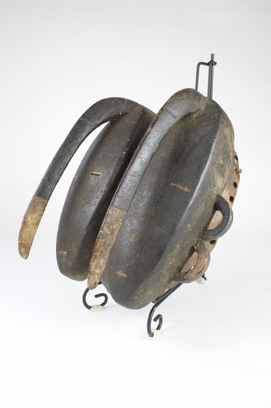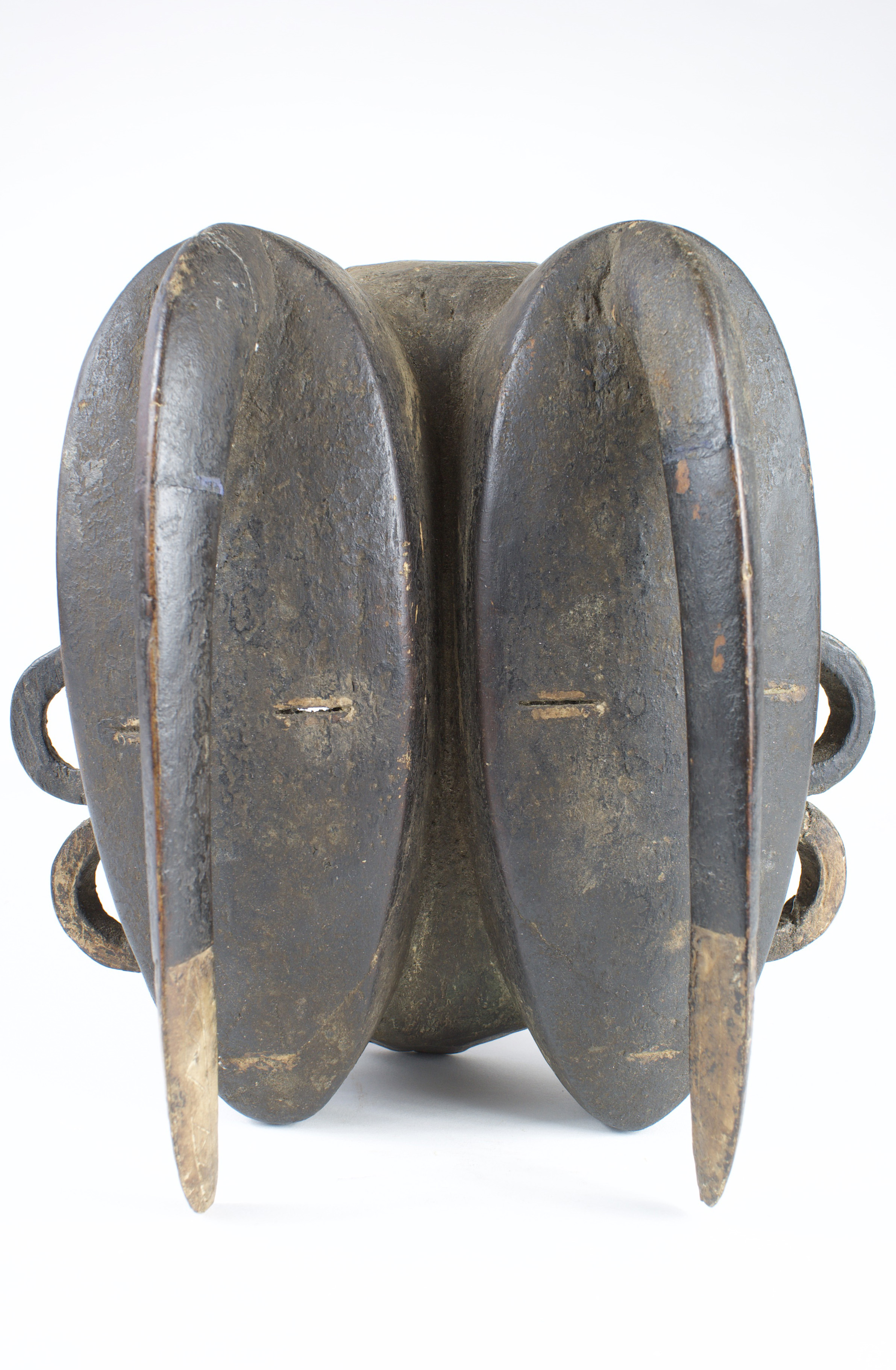 The ovular wooden Ligbi mask has two faces, with thin slits for eyes and thinly painted lines for the mouths. Hanging vertically from the top of the mask, covering either face, are forms that resembles the beak of a hornbill bird. On either side of the mask are sets of double ears created by semi-circle loops.