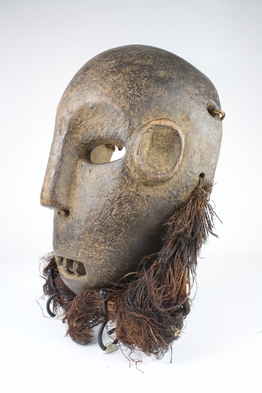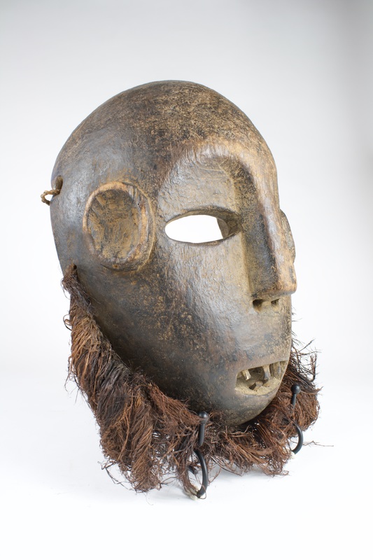 The carved mask has a rough surface with remnants of natural materials pressed into the wood. Along the chin, raffia has been woven through hollowed grommets. The facial features are minimalistic, with little detail in the eyes and nose. Lining the upper lip are small teeth, potentially from a small animal. Round ears rest on either side of the mask, creating a symmetrical face.