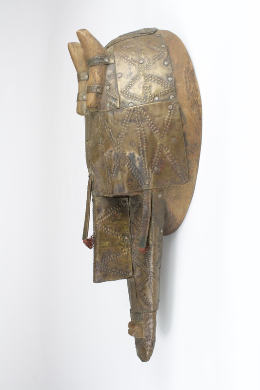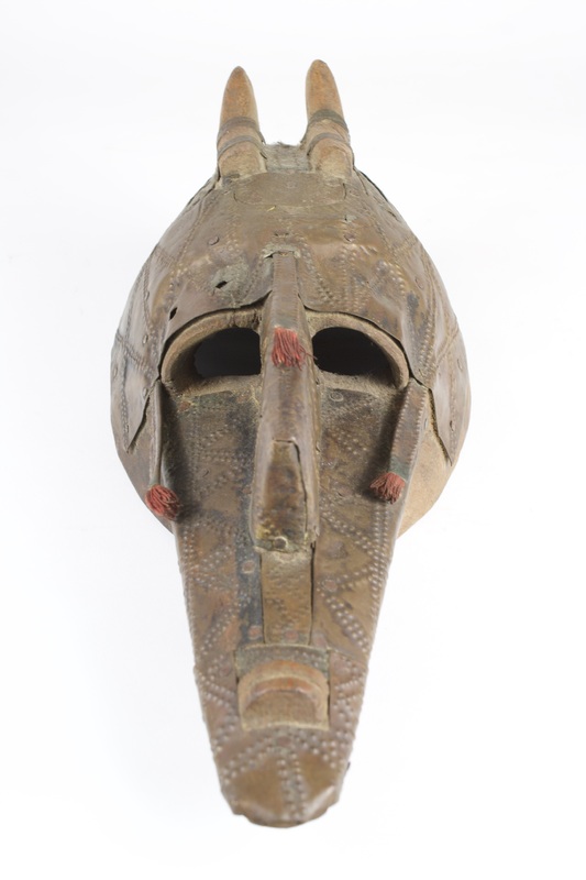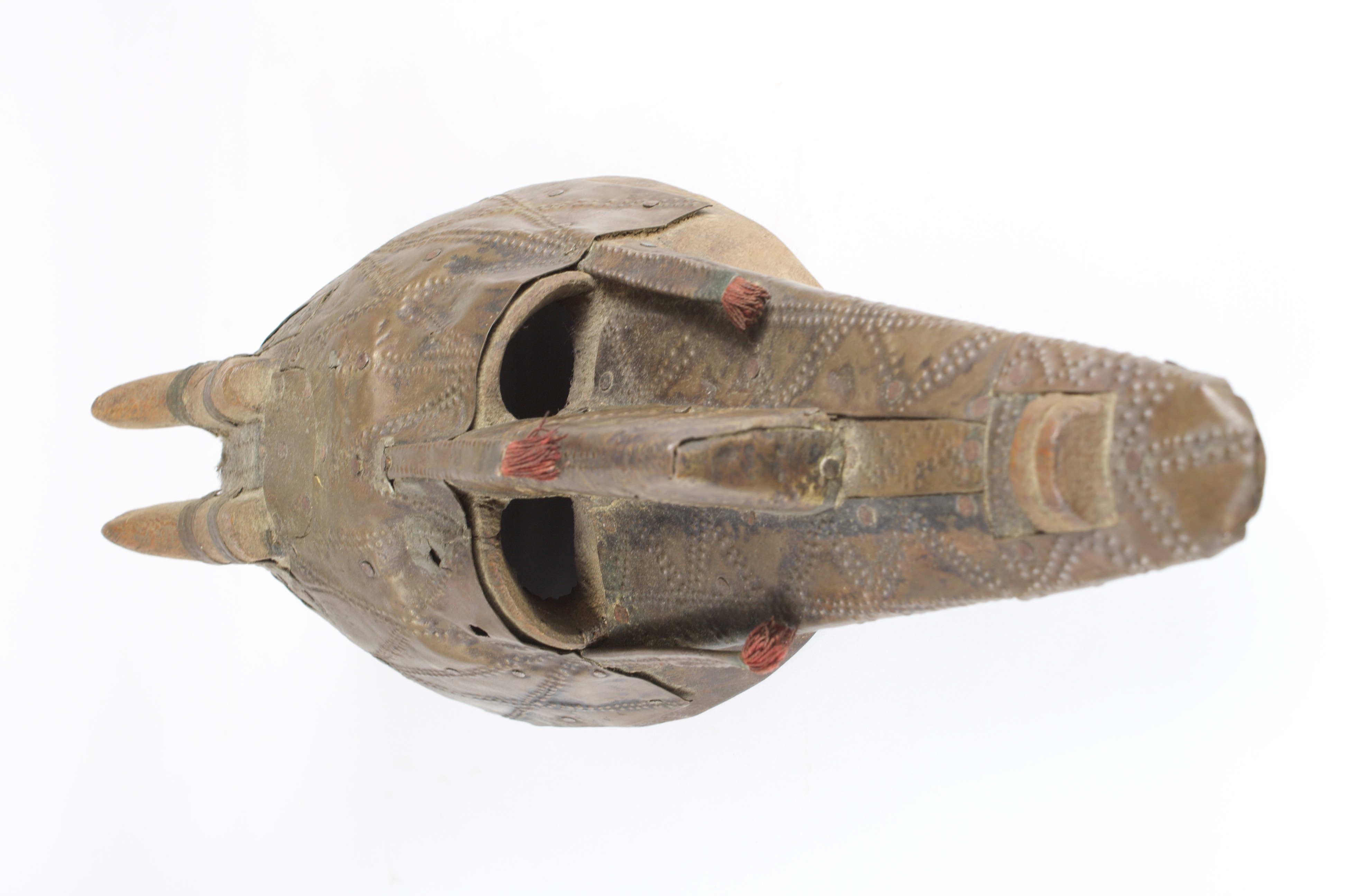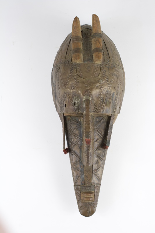 The copper plated mask has a vertical emphasis, forming a narrow face. Two small wooden horns are attached to the front of the forehead, and three thin rods hang below the brow bone with small tassels. The facial features and overall formation of the mask is reminiscent of the Bambara and Marka "Ngolo" or "N'tomo" masks, which have a ceremonial function, providing strength and protection.