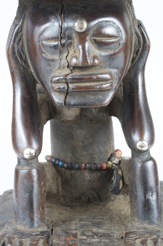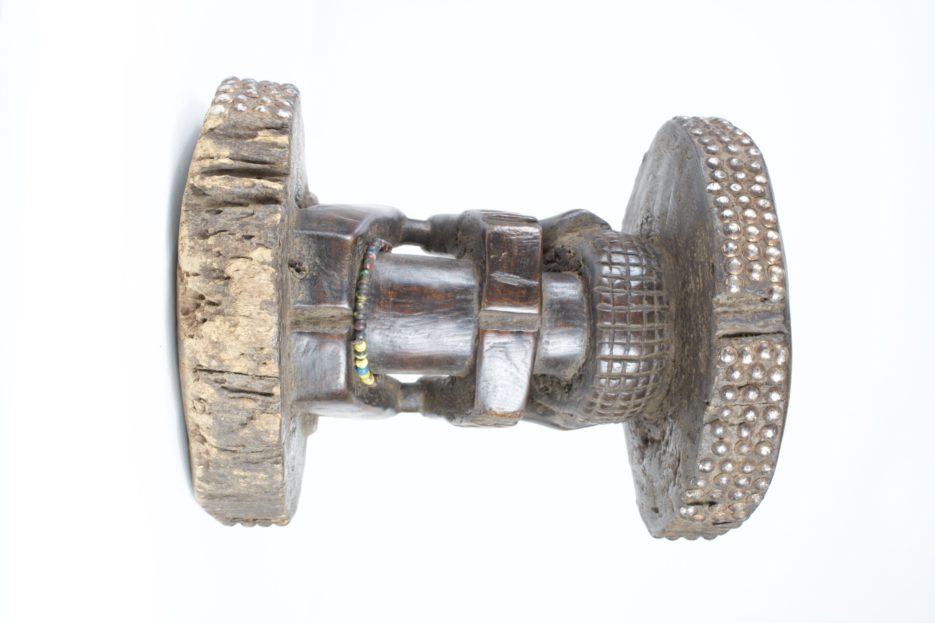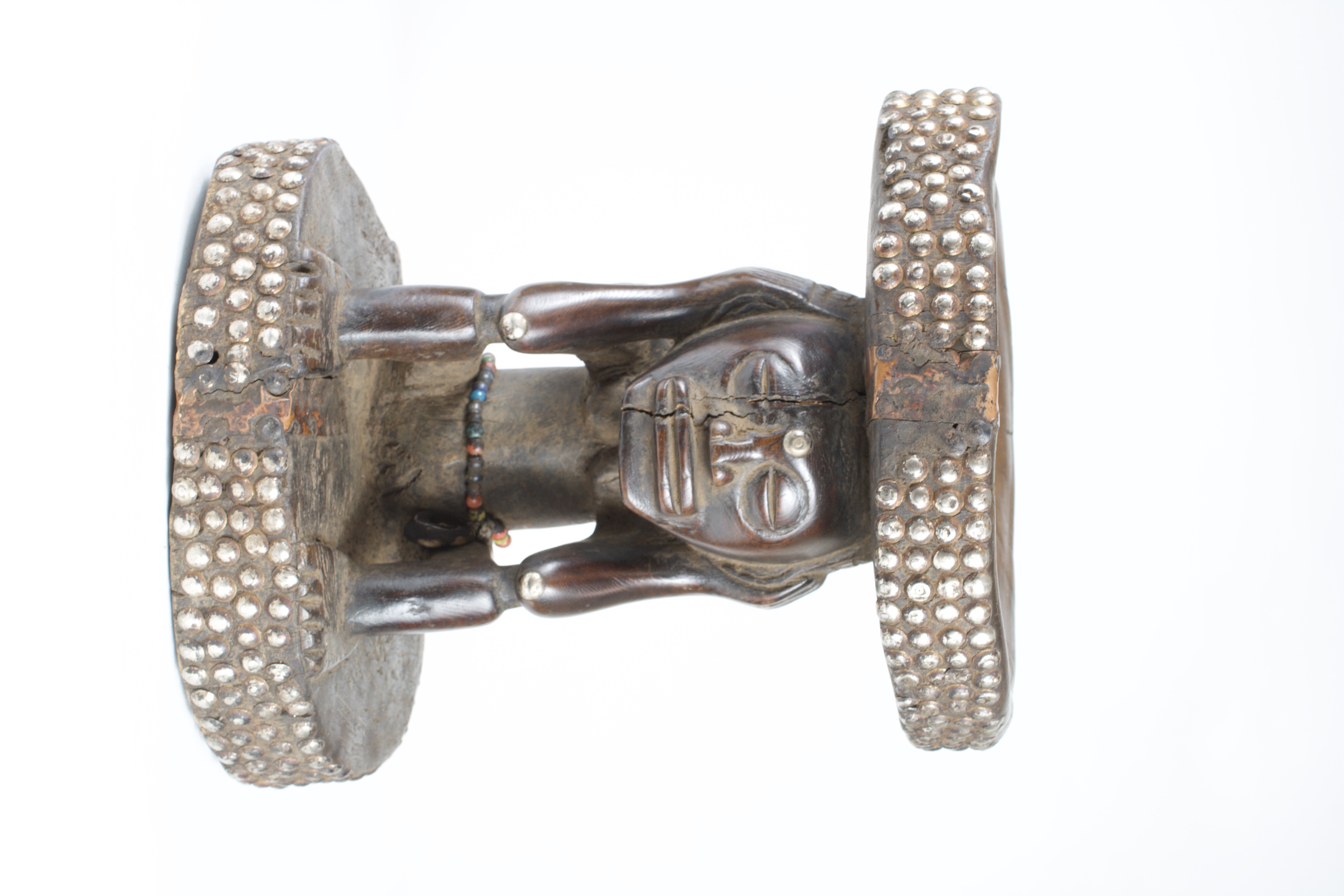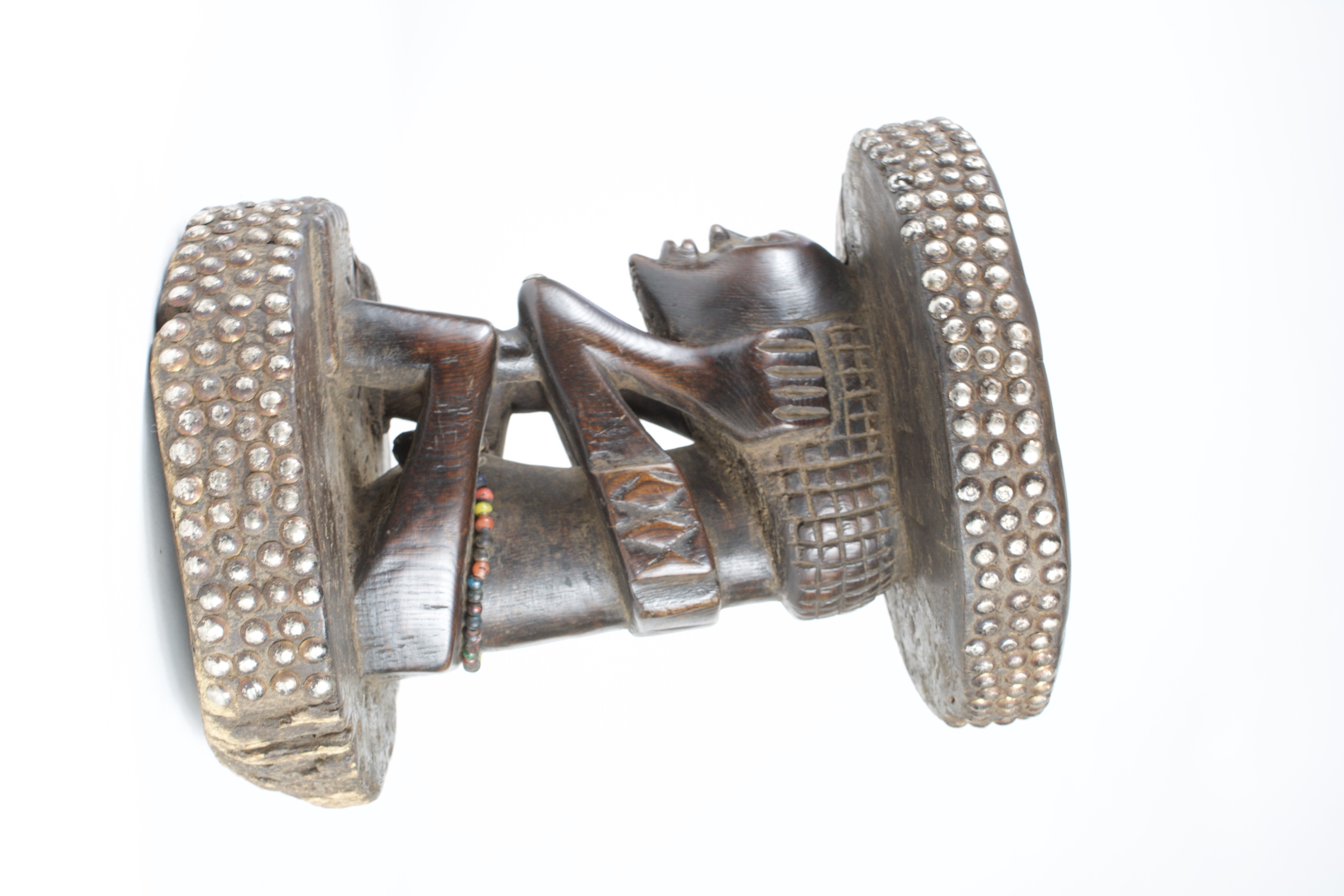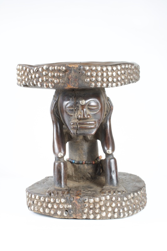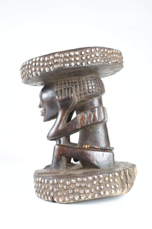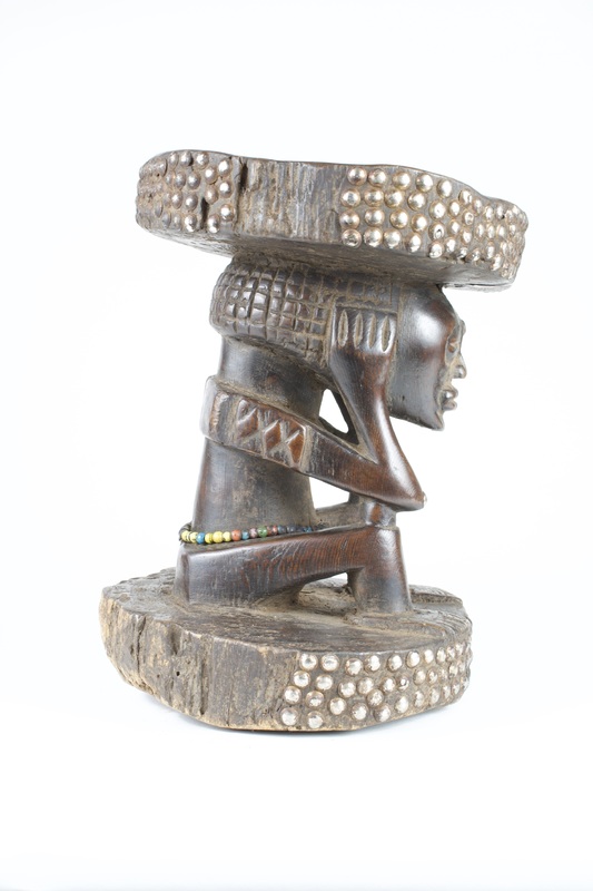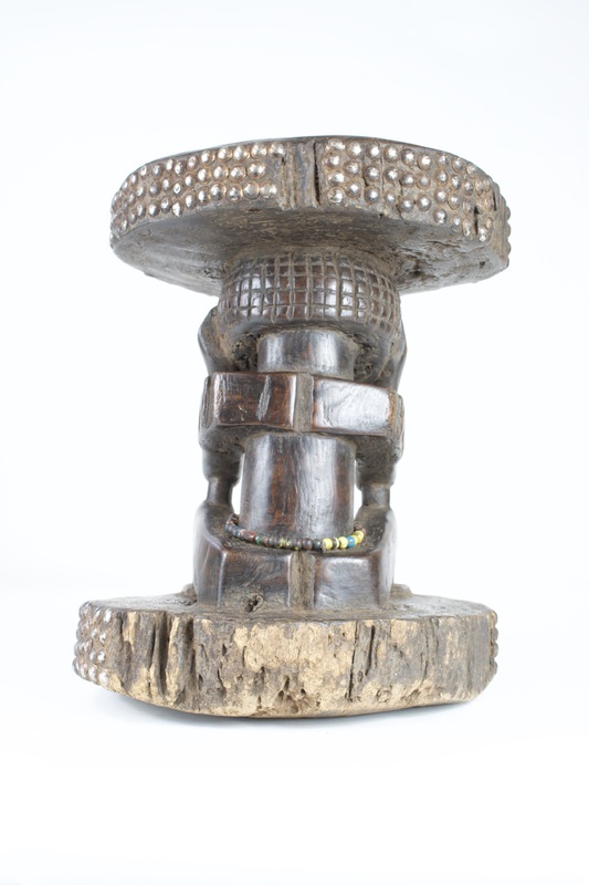 The Luba stool is carved of wood, with metal pins lining the base and seat. Thin sheets of metal can be seen on the base of the stool and on the seat in line with the front of the figure. These metal sheets may have been used to repair cracks in the wood. The figure is seated with its elbows resting on its knees, and hands cuffing around the ears. Female genitalia can be seen on the figure, along with colorful glass beads wrapping around the waist. They elbows and glabella have been decorated with metal pins. The face of the figure has a horizontal emphasis, with narrow eyes and a thin, wide mouth. This highly decorated Luba stool was most likely used by those in leadership roles. Stools of such a style were often used as decoration, however this stool appears to have some wear as noted by the metal sheets.