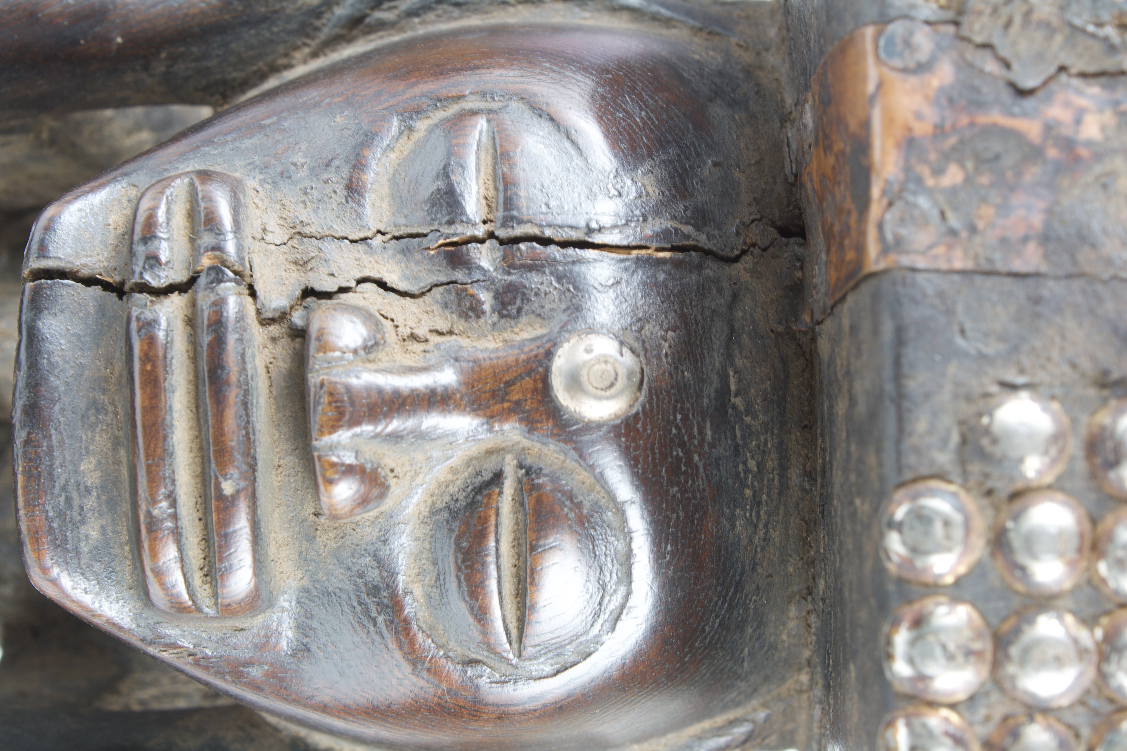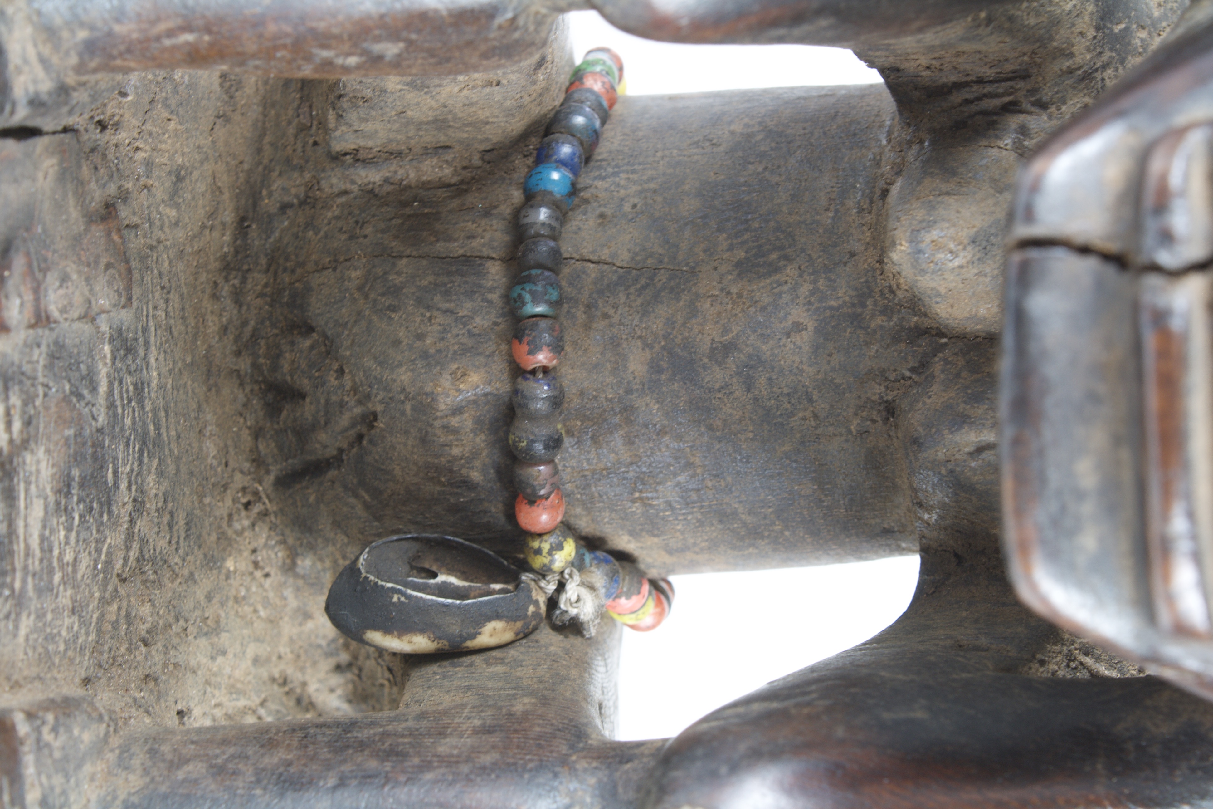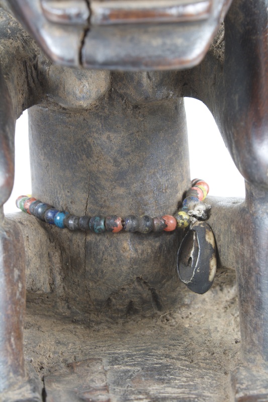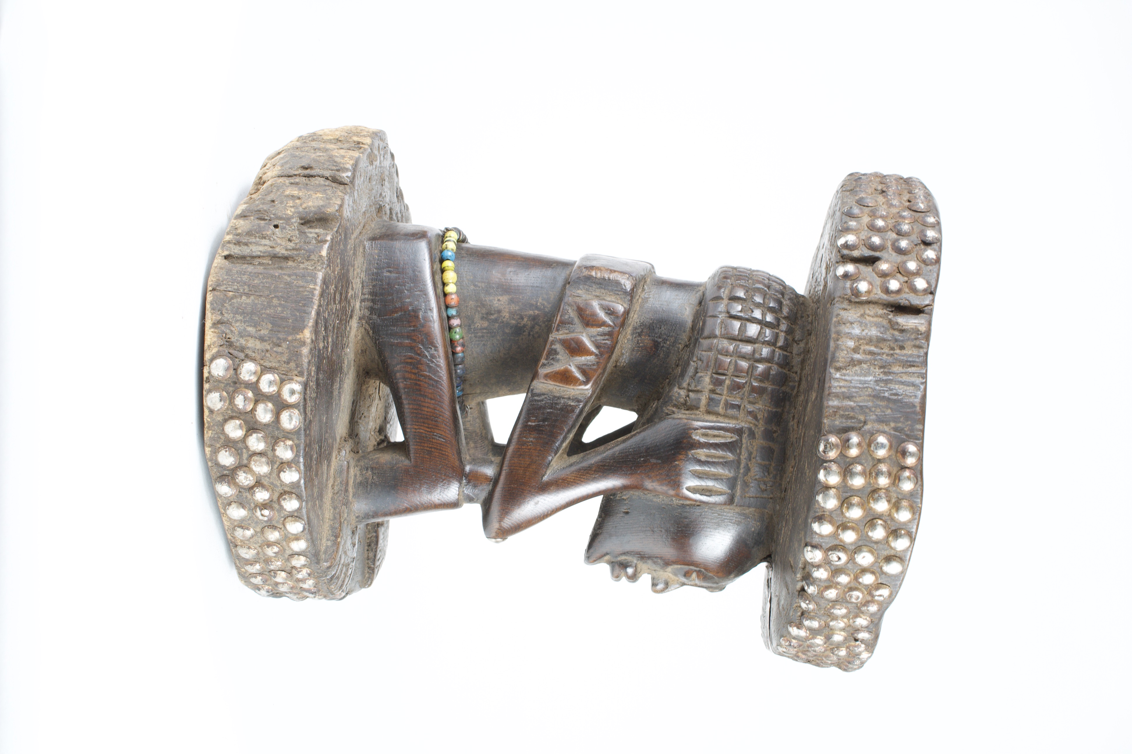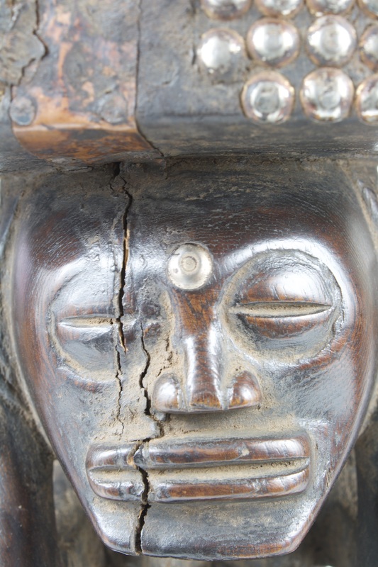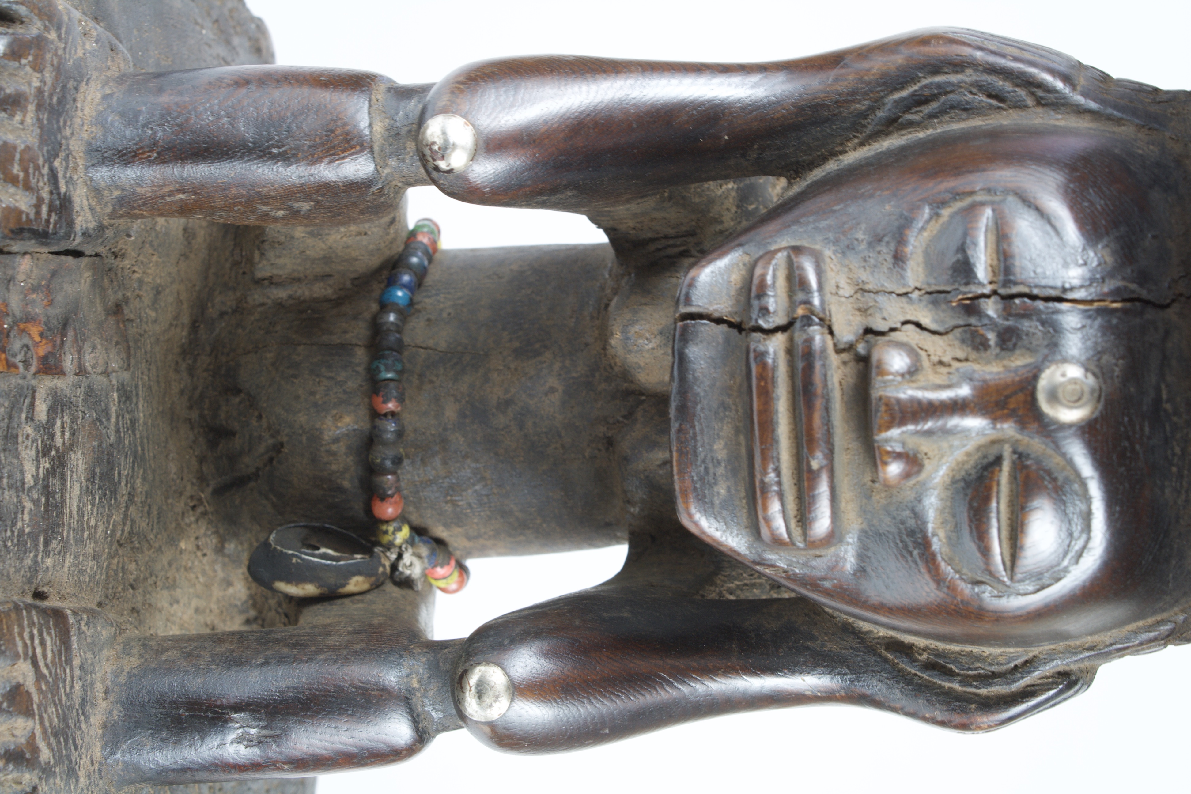 The Luba stool is carved of wood, with metal pins lining the base and seat. Thin sheets of metal can be seen on the base of the stool and on the seat in line with the front of the figure. These metal sheets may have been used to repair cracks in the wood. The figure is seated with its elbows resting on its knees, and hands cuffing around the ears. Female genitalia can be seen on the figure, along with colorful glass beads wrapping around the waist. They elbows and glabella have been decorated with metal pins. The face of the figure has a horizontal emphasis, with narrow eyes and a thin, wide mouth. This highly decorated Luba stool was most likely used by those in leadership roles. Stools of such a style were often used as decoration, however this stool appears to have some wear as noted by the metal sheets.