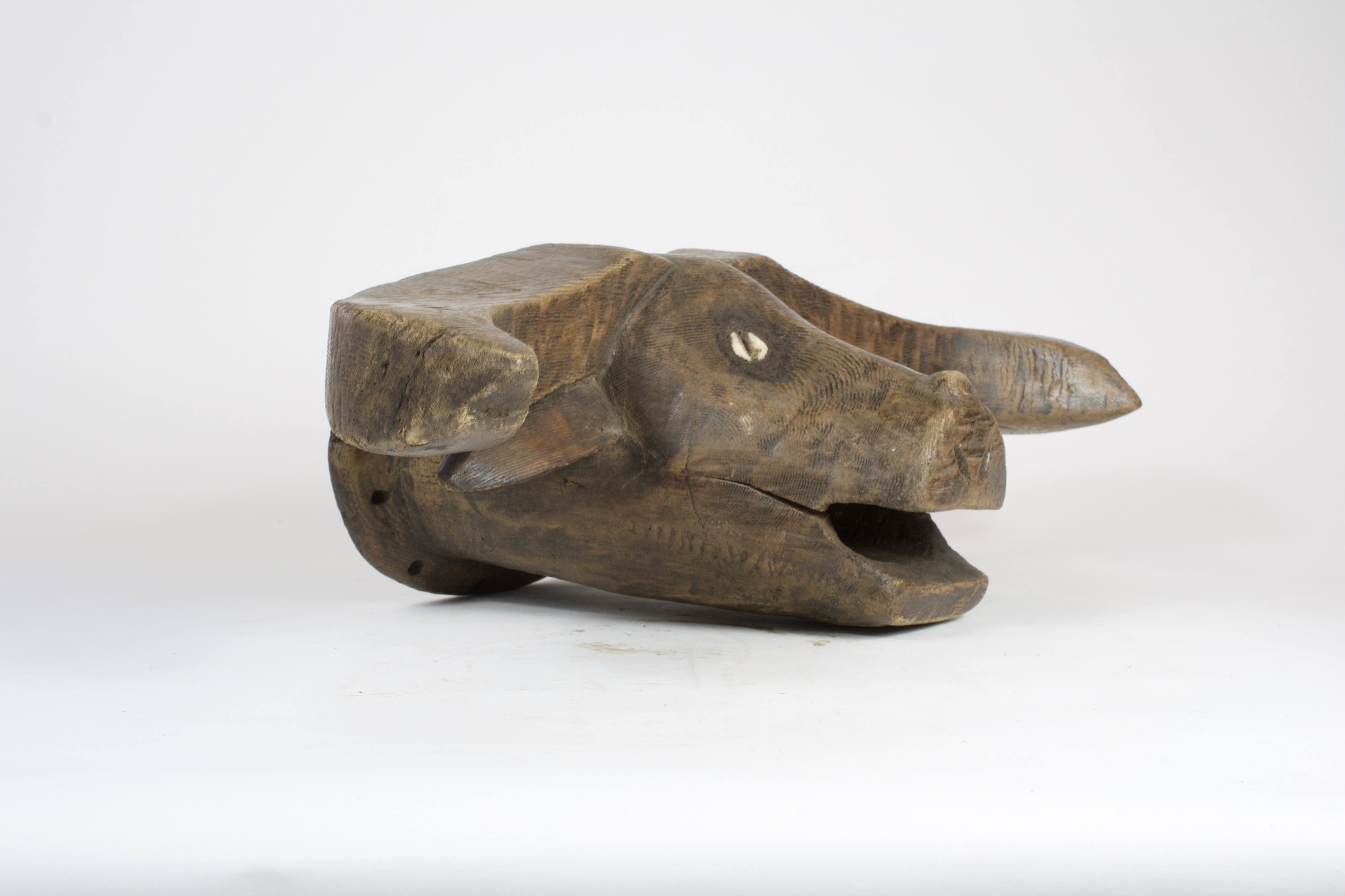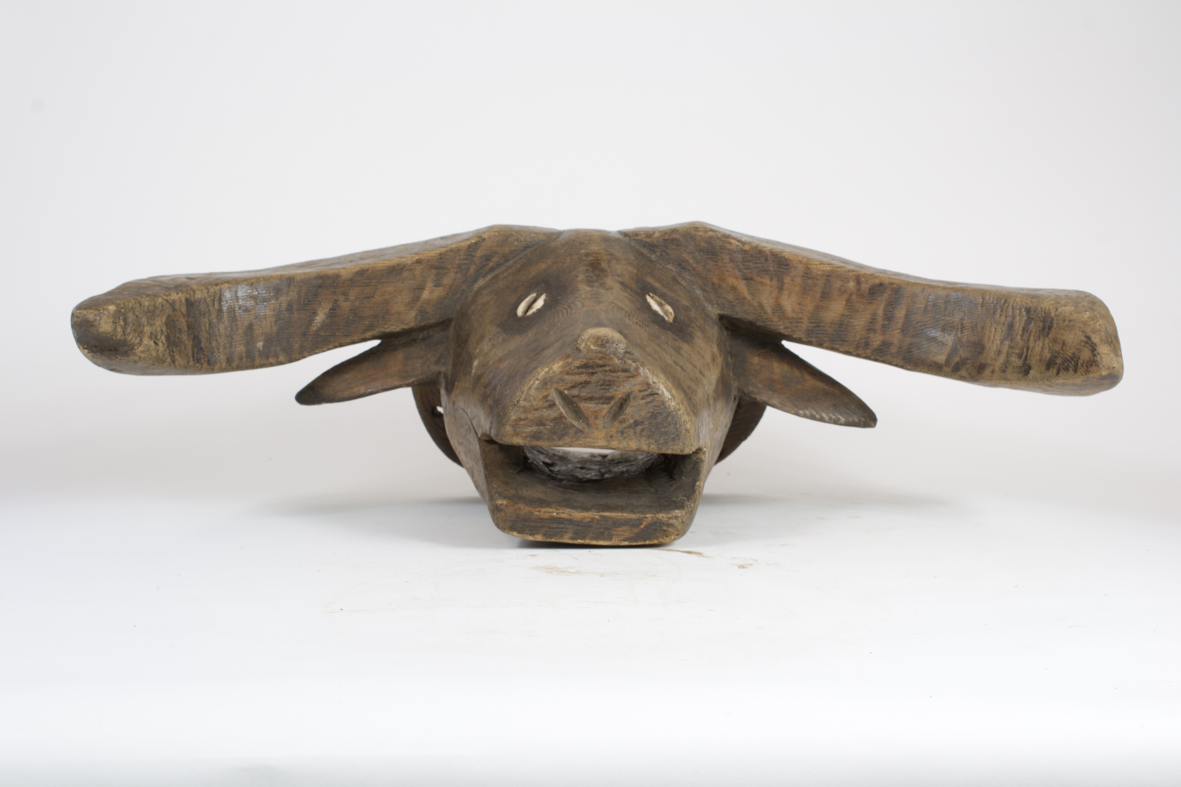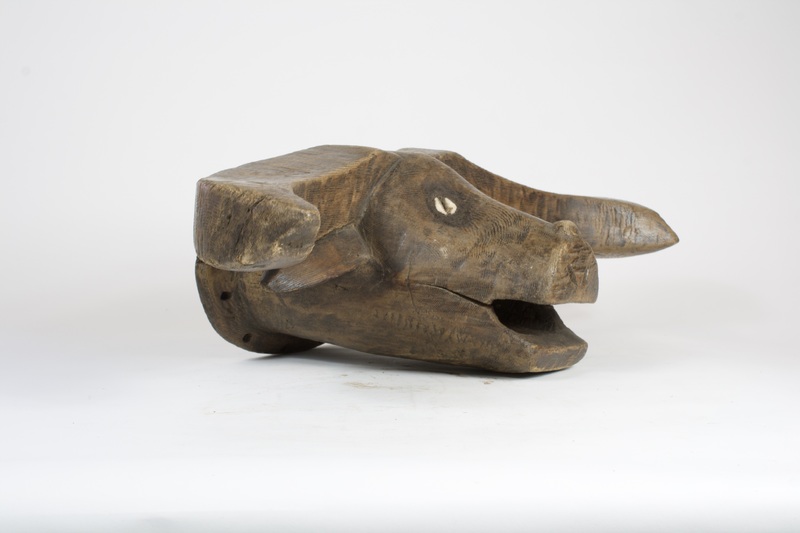 Kiyunde (buffalo) mask with elongated horns flaring out on both sides and a squared-off snout with shell eyes. It represents the male wild buffalo and is connected to ideas of strength, leadership, and cultural heroes.