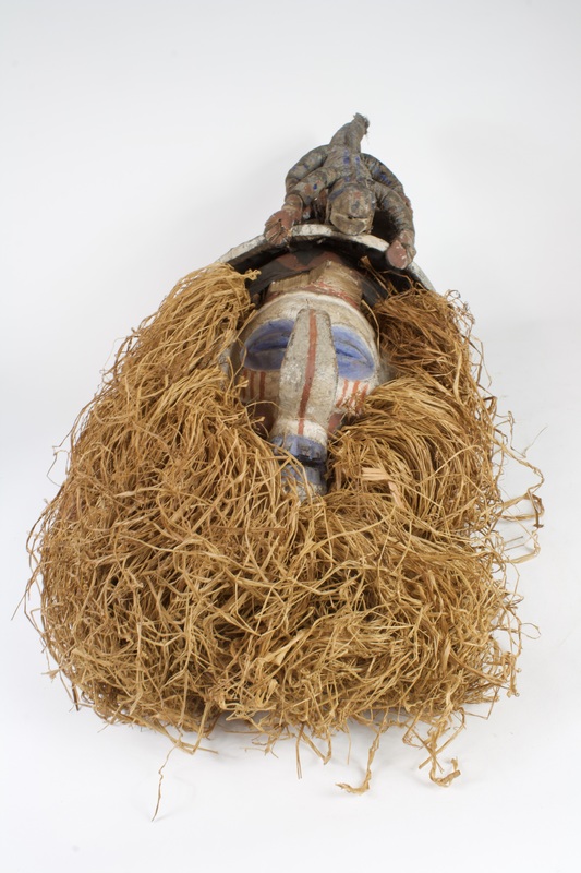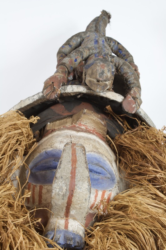 The Yaka "kholuka" mask is carved of wood with raffia surrounding the head. The nose is turned upward, the mouth is open with individually articulated teeth, and the face is brightly painted creating an expressive image. This facial construction is used to depict Yaka sexualtiy and spirituality. Atop the head is lizard constructed of tightly joined fabric pieces, covered in pigment of similar coloration to the face. The mask is representative of those used during initiation rituals like the "n-khanda" ceremony marking the transition from boy to man.
