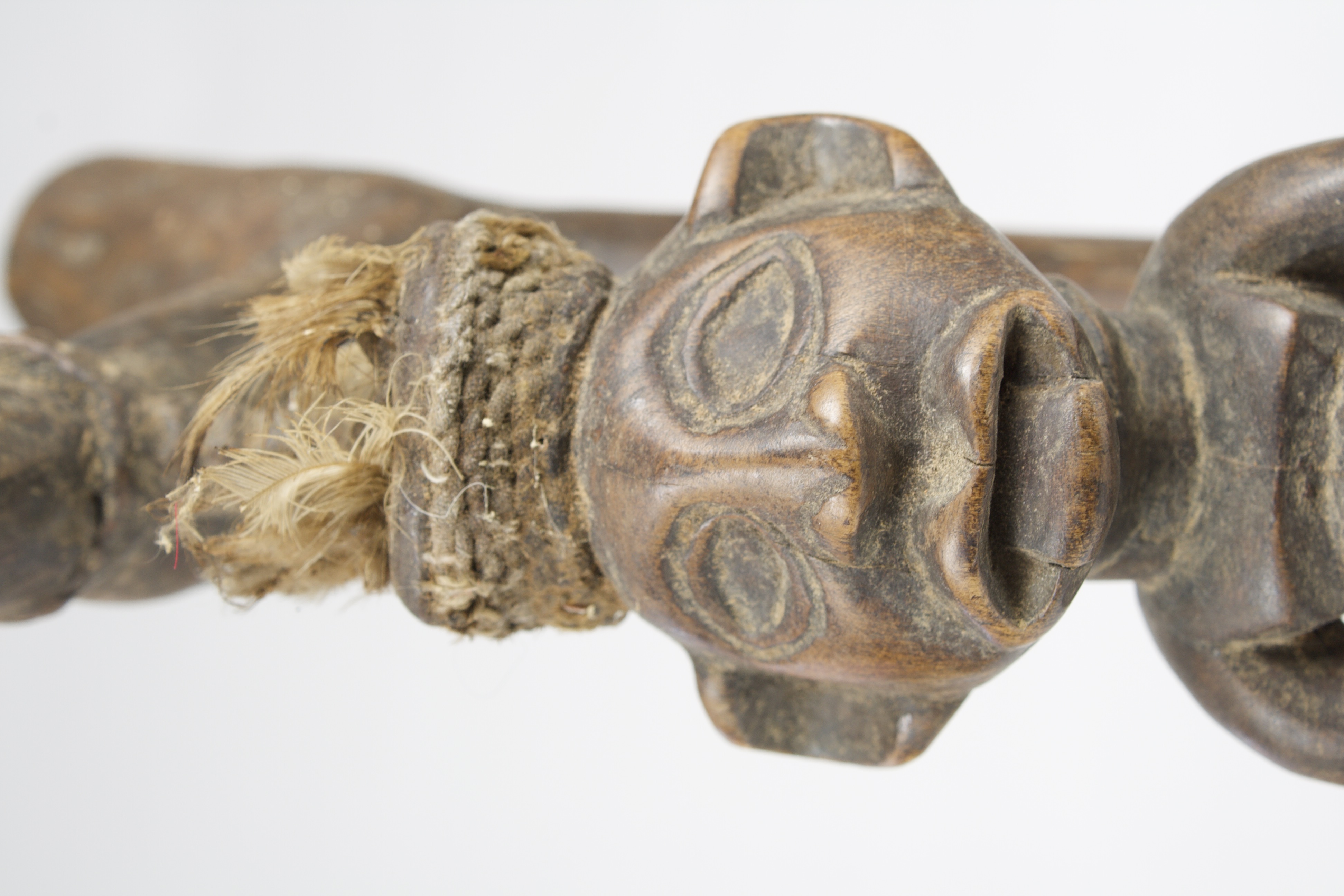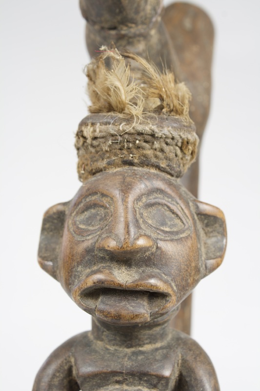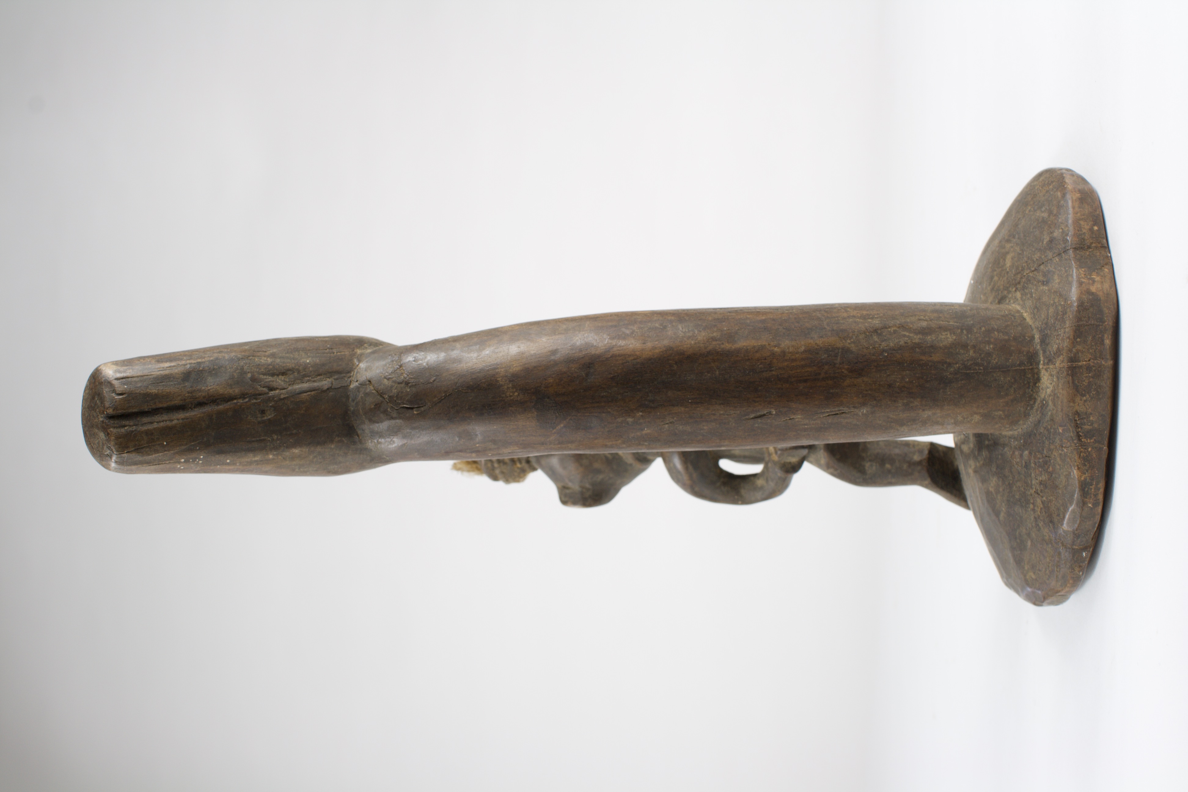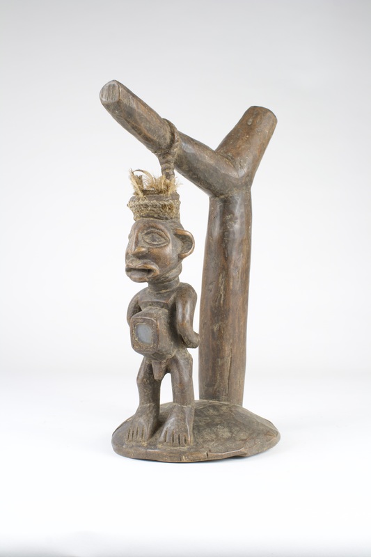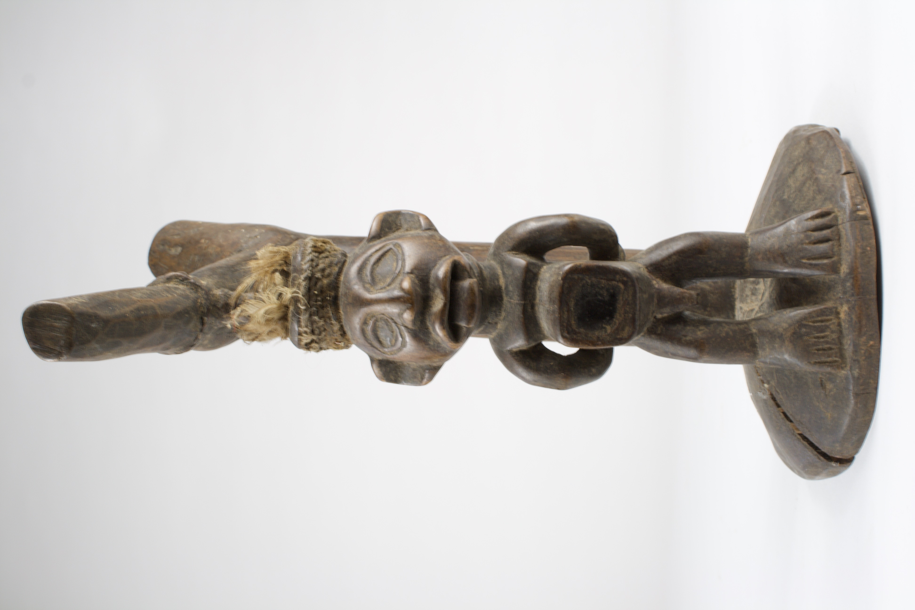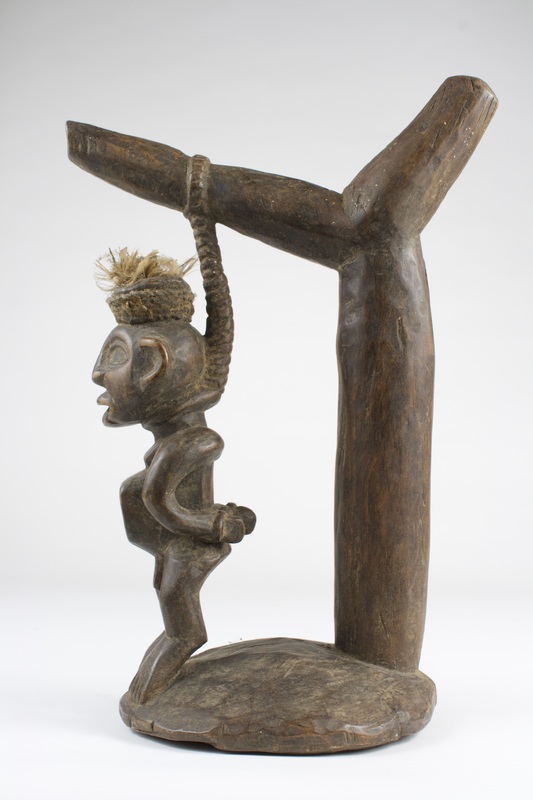 A figurative sculpture depicting a hanged man with arms tied behind his back. Facial features are exaggerated and stylized, with a fiber headdress on top of his head. This sculpture is seen as a cult figure that could be used to warn criminals who might face the fearful penalty for their unethical actions.