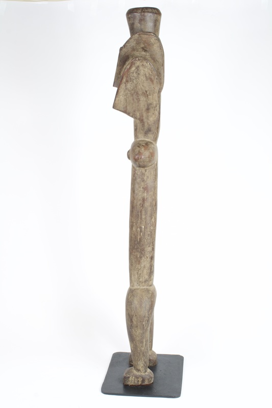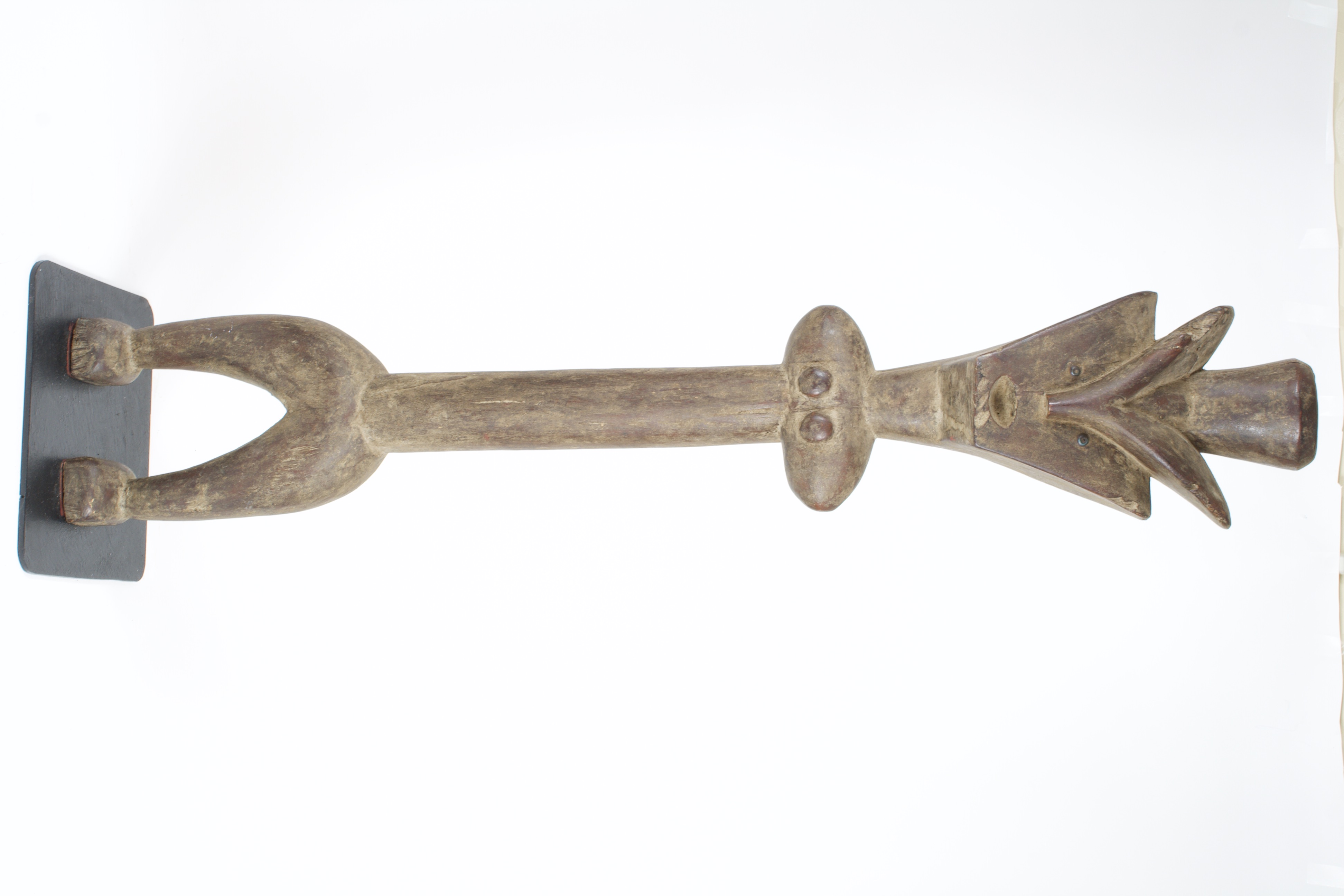 An elongated, figurative statue featuring short, bowed legs and a long torso. Its head is triangular with a deep, angled ornament on top and flat facial features. It is highly stylized and used at the end of ceremonies, following the masquerades. It may represent an ancestor figure.