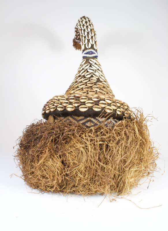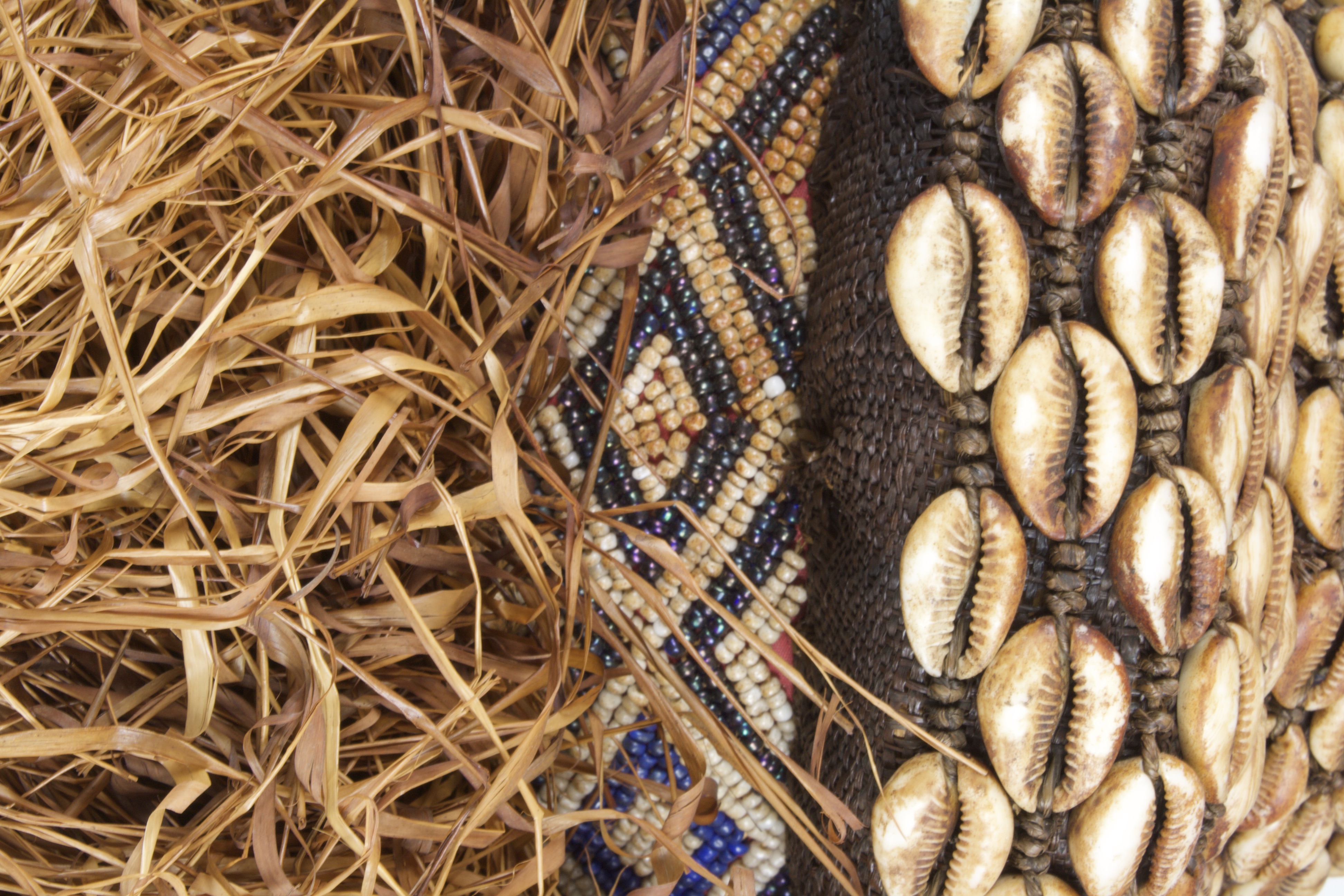 Wood, woven plant fibers, raffia, cowrie shells, beads, other natural materials