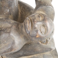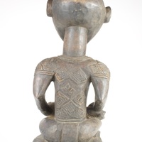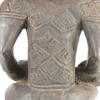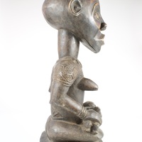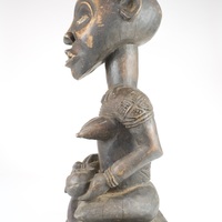 The commemorative, seated mother and child figure is a common archetype of feminine beauty in Kongo history. The mother sits, cross-legged with a small child across her lap. The proportions are exaggerated, as the mother figures head is enlarged in comparison to the rest of the body. Though hollow, the eyes may have had inlaid glass. Eyes made of glass would indicate the commemorative role of the sculpture, as the reflective quality of the material serves as a connection to the ancestral realm. The teeth are filed and shaped along the top and bottom lips, and the nostrils flare outwards. The elaborate coiffure atop the mothers head indicates a woman of elite status. Spanning across the figures shoulders and chest are scarification patterns carved at a high relief. The child figure is less detailed, laying on its back with its arms placed over its torso.