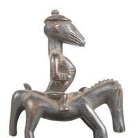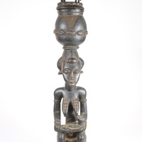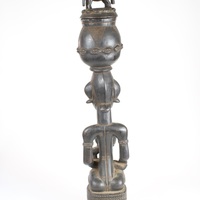 A sculpture depicts a seated maternity receptacle with a lid that features an equestrian figure. A seated female figure shows various scarifications on her breasts, where a baby is suckling to sustain his vitality. A line of a conch shell decorates the surface of a receptacle vessel. All these detailed elements are symbols of fertility. Although Senufo society is patriarchal, inheritance passes through the matrilineal line. The importance of maternity is generally reflected in the sculpture's content.