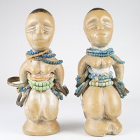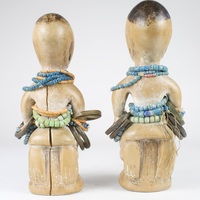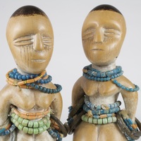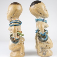 The wooden carved female twin figures are highly decorated with dark pigments, glass beads and metal jewelry. The bodies are rounded, kneeling with their arms at their sides. The eyes are closed with thinly incised lines marking the eyelids. Scarification patterns run vertically up and down the cheeks. Twin figures were created to commemorate either one child or the set of twins after death. Twins are believed to have spiritual powers in communities of Nigeria like Yoruba, thus memorial figures were often created.