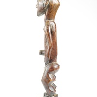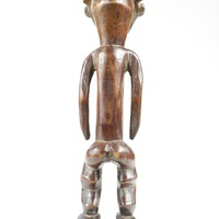 The standing male figure is carved of wood with a dark patina. The head is proportionately larger than the body and topped with a stylized coiffure. Ears have been carved on either side of the head in line with bulging eyes and a centered nose. The mouth is square in juxtaposition with the rounded forms of the other features. Above the eyes on the brow ridge are small holes indicating scarification patterns. Arms reach downward towards thicker, short legs. The abdomen is long and narrow, with carved breasts and male genitalia, along with a protruding navel.