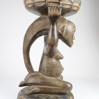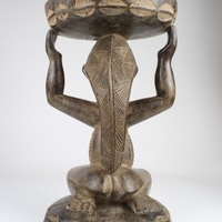 The carved wooden stool has clear characteristics of the Luba style, such as the facial features and seated position. The figure is female with a round abdomen and pronounced navel, decorated with scarification patterns. The base of the stool and round seat supported by the figures arms are decorated with a wrapping pattern depicting cowrie shells. The stool has a functional construction however it was most likely used for decorative reasons, or as a metaphorical seat of kingship for the Luba leadership.
