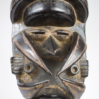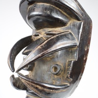The Gere mask is carved of wood with a thick, dark patina. The forehead bulges forward, with a thin central division. The eyes are formed by narrow horizontal openings under the forehead. The nose and mouth extend forward with sharp angles to compliment the four horns that round inward to the center of the mask. on either side of the face, under the nose, are small holes alongside horizontally incised lines.