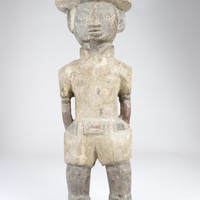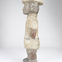 The small, standing colonial figure represents the influence of the European settlers in the Baule area in the early 20th century. The figure is painted to reflect the aesthetics of European attire, such as the large white hat. It was common practice for small standing figures to be made as "spirit lovers", or an ideal vision of a spouse. It is possible that the small colonial figure was created as a spirit lover, that reflected the new societal ideals introduced by the Europeans.