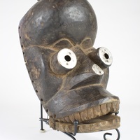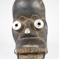 Carved wooden mask, with hinging jaw and round iron forms to represent eyes. The forehead and the upper jaw protrude, to create exaggerated features. The Dan mask may be associated with forest spirits, manifesting their powers. This mask can be grouped into the 11 major types of figures used to represent varying social topics such as education, politics and entertainment.