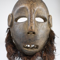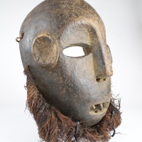 The carved mask has a rough surface with remnants of natural materials pressed into the wood. Along the chin, raffia has been woven through hollowed grommets. The facial features are minimalistic, with little detail in the eyes and nose. Lining the upper lip are small teeth, potentially from a small animal. Round ears rest on either side of the mask, creating a symmetrical face.