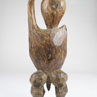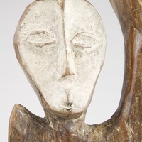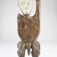 Wooden standing male figure with white kaolin, heart-shaped face. The figure has one arm extended upward and the other appears to have been excluded from the design intentionally.The central abdomen is flat, carved into a board like shape. When used in ceremonies, the figure may have small holes carved into the abdomen. This object would have been within one of two baskets among other wooden figures for initiation ceremonies.
