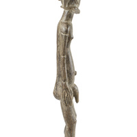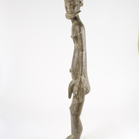 The male figure is carved from one piece of wood, as if stemming from the rounded base beneath its feet. The figure is thin with a vertical emphasis. Common characteristics of Dogon sculpture can be seen through the bend in the knees and the turned head. Carved statues such as the one pictured were often ancestral figures placed on altars.