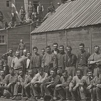 Mine workers pose outside the Hecla Mining Company #3 rock house in 1878