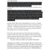 "I started writing this journal to collect my thoughts and put them down in one place so that they wouldn't just be swirling around in my head plaguing my mind. It was helpful to write out how I felt as I felt the feelings. As I read back my emotion journal to myself, I realized that this wasn't the only place I had collected my thoughts. I went through some Facebook posts I had made as well about how this was affecting me, particularly in terms of my school work and my mental state and there are quite a few posts I made about how the pandemic was affecting my ability to function. This item is important to me because it is an example of how COVID-19 impacted people in more ways than one. The uncertainty and fear of the virus sent my mental and emotional health into a whirlwind, and my brain into survival mode. I have struggled with mental health issues in the past, mostly related to anxiety and depression, and the threat of the virus and a global pandemic only heightened and triggered these old feelings. As I noted in my journal several times, I haven't felt this way since high school. Although I will note that I have good days and bad days. I still seem to have trouble prioritizing my school work even on the good days, which is an indicator to me that not only is my depression and anxiety heightened, but my ADD symptoms are harder to control when trying to manage schoolwork from home, with no set schedule to maintain. Surprisingly having less places to be and people to see, destroyed my sense of routine and responsibility and my ability to maintain a set schedule that would assist me in being able to complete assignments, which isn't necessarily highlighted in these journals, but I figured needed explaining to add another layer to this perspective."