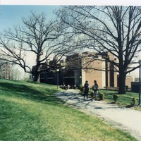 Springtime up the walkway towards Whittemore Library