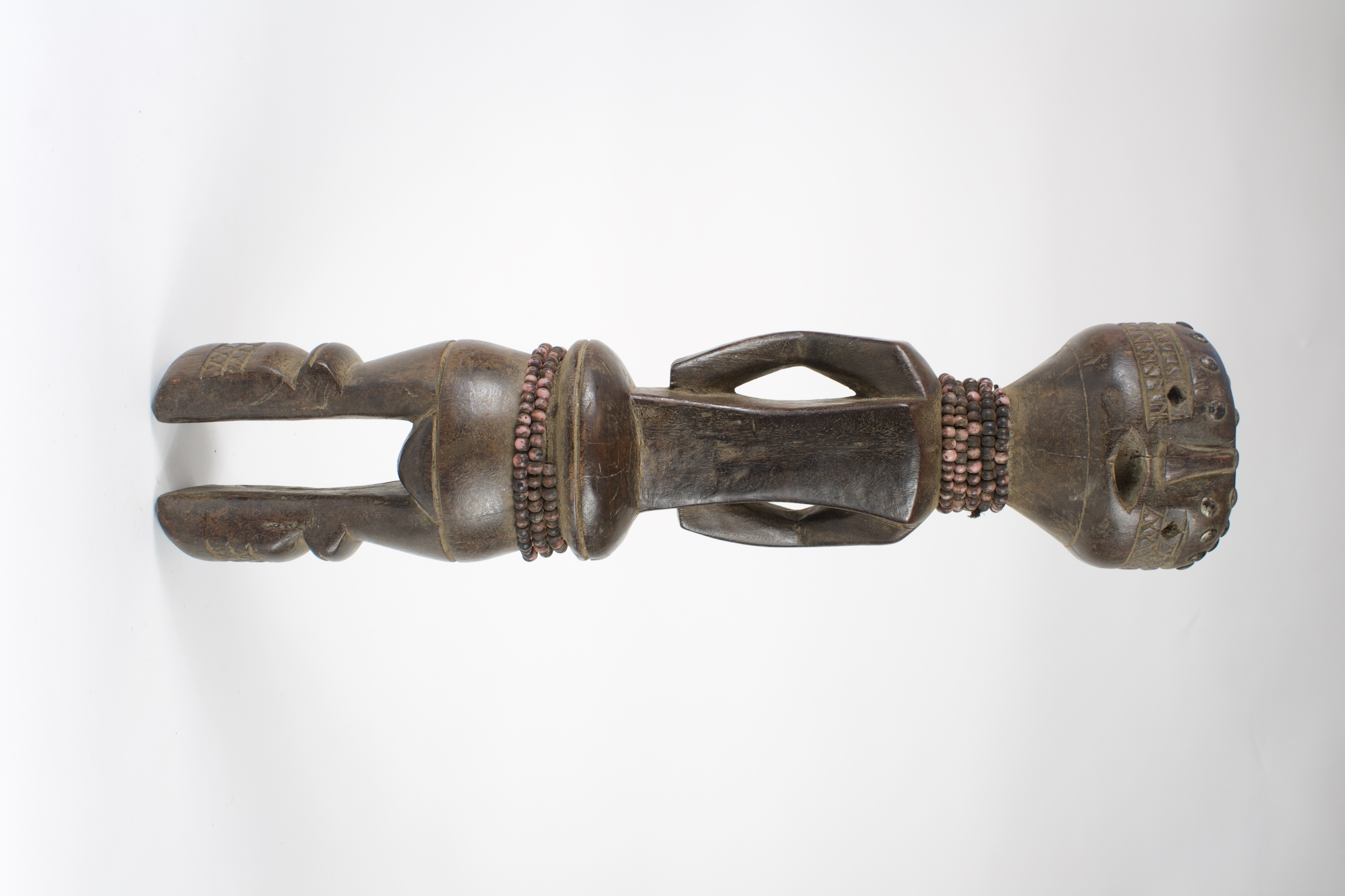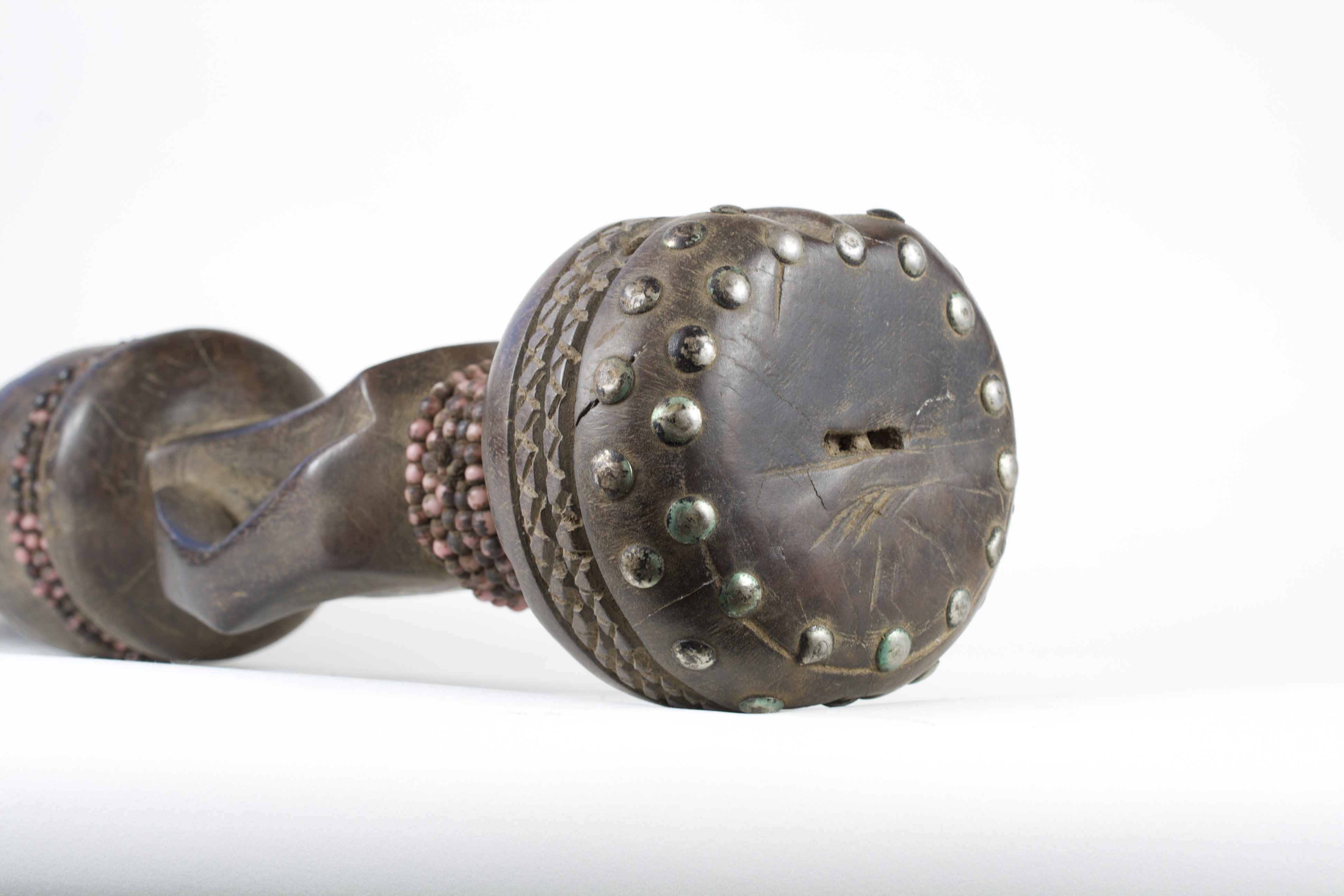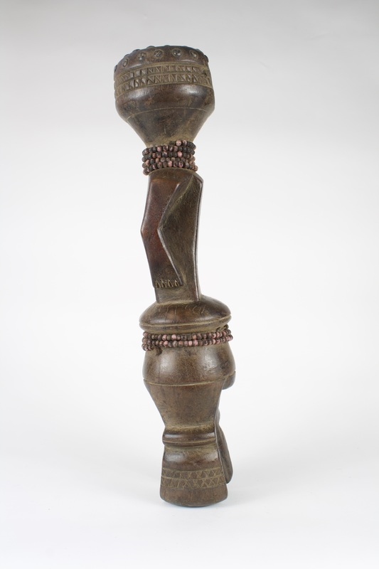 Standing figure with a long torso and arms resting on its side. The figure is decorated through carved patterning on the legs and head, along with beads wrapped around the waist and neck. The face is comprised of hollow, round eyes and an oval mouth, with a narrow nose at a higher relief. Metal pins are set around the head, and a small hole is present on the flat plane on the top of the head. This standing female figure may represent Nabo, one of the messengers of the deity Gale. Nabo figurines are placed in family altars as protection from hardship alongside the Seto, male figure. The scarification patterns, beads and decoration on the head are all reflective of the aesthetics of fertility figures.
