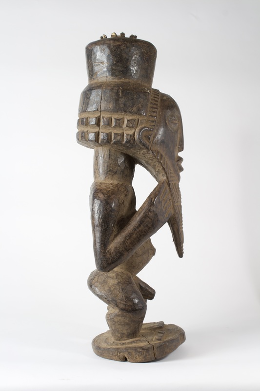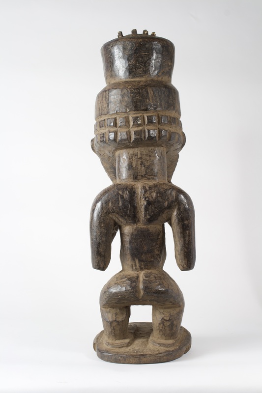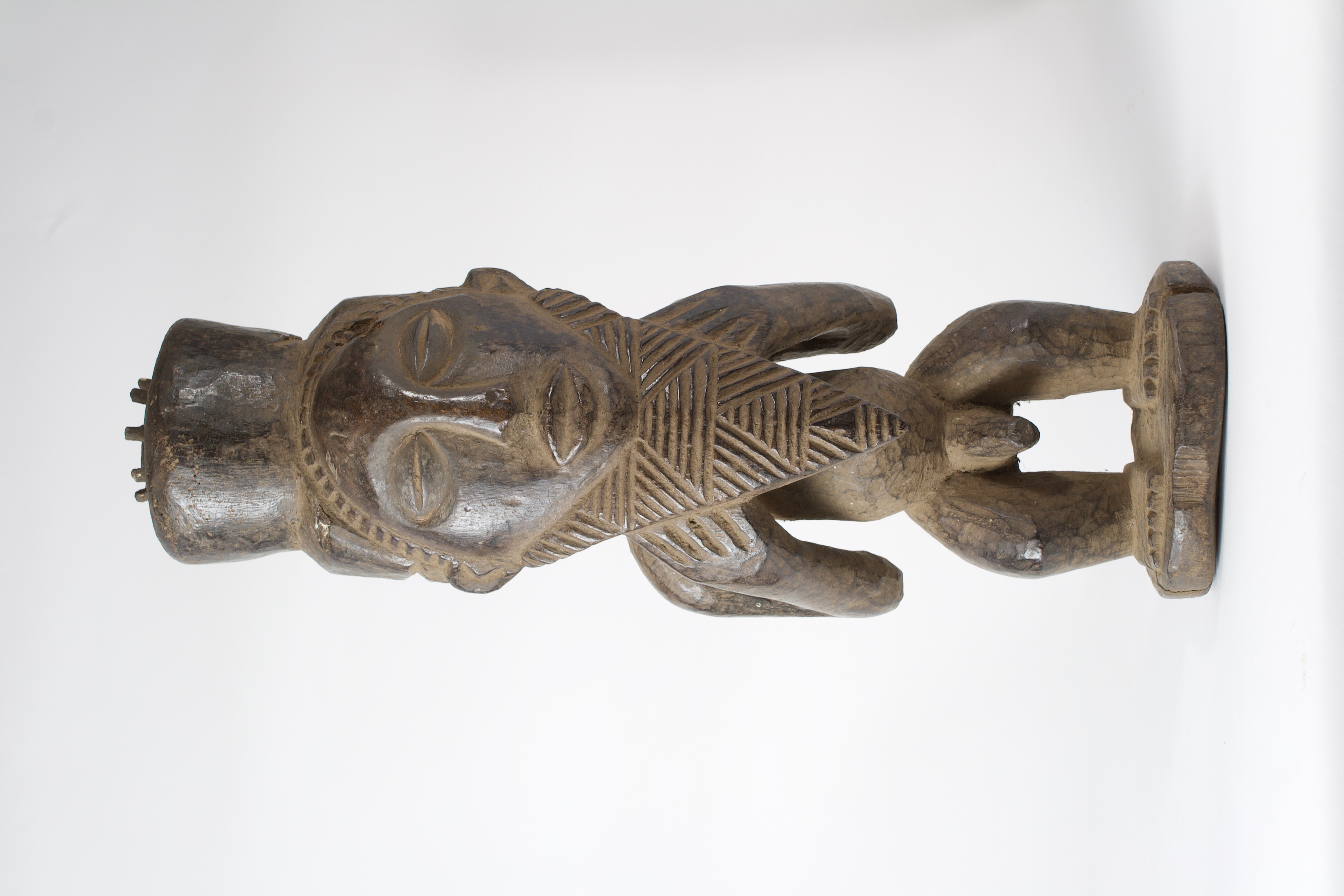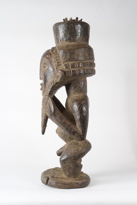 Carved male standing figure with hands holding a long, patterned beard and stylized adornment on the top of the head. The sculpture may represent an ancestral figure, or leadership figure within the Kusu society. The geometric, detailed patterning of the beard is a stylistic references to textile works, and other works of the Kusu, Luba and Hemba styles.