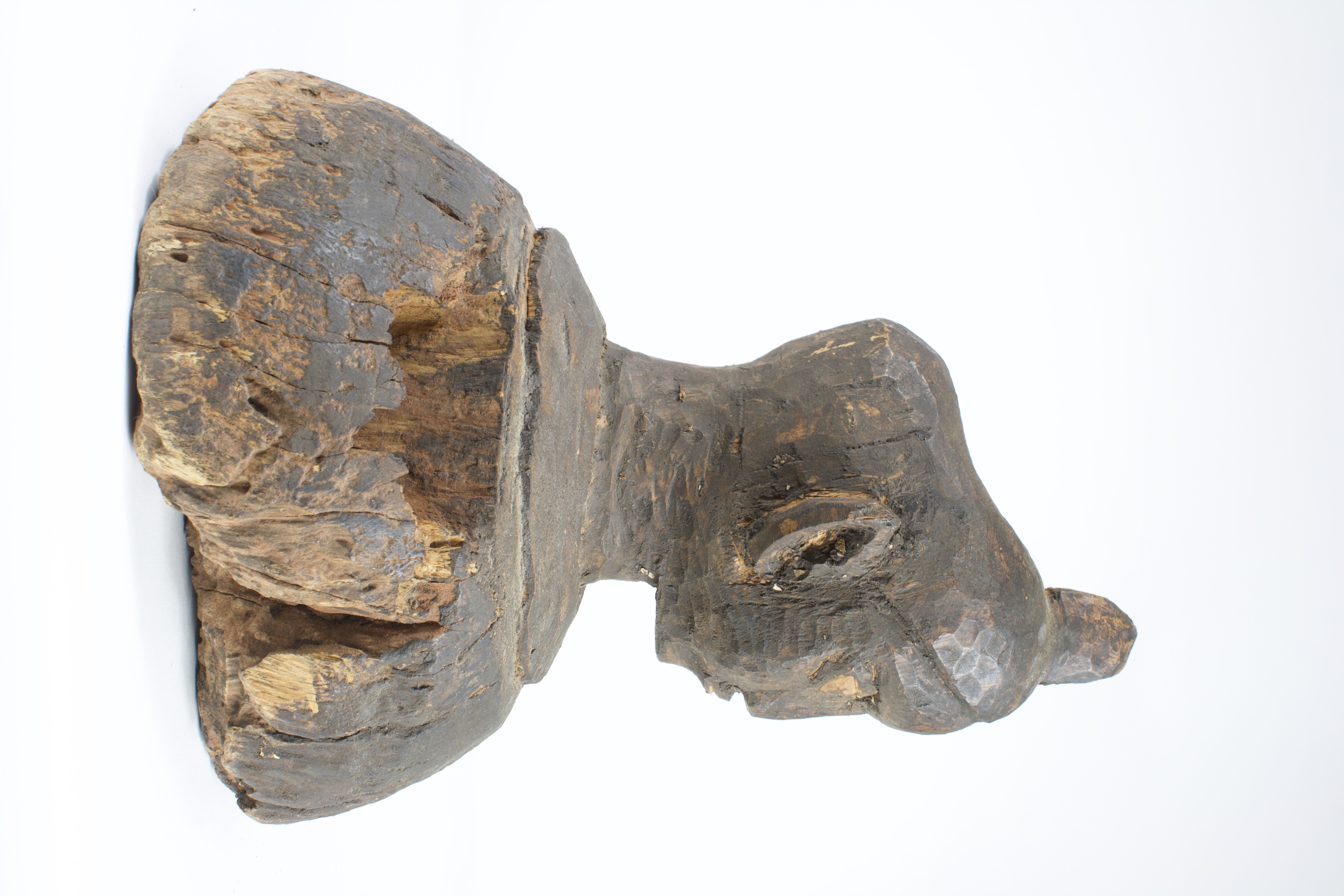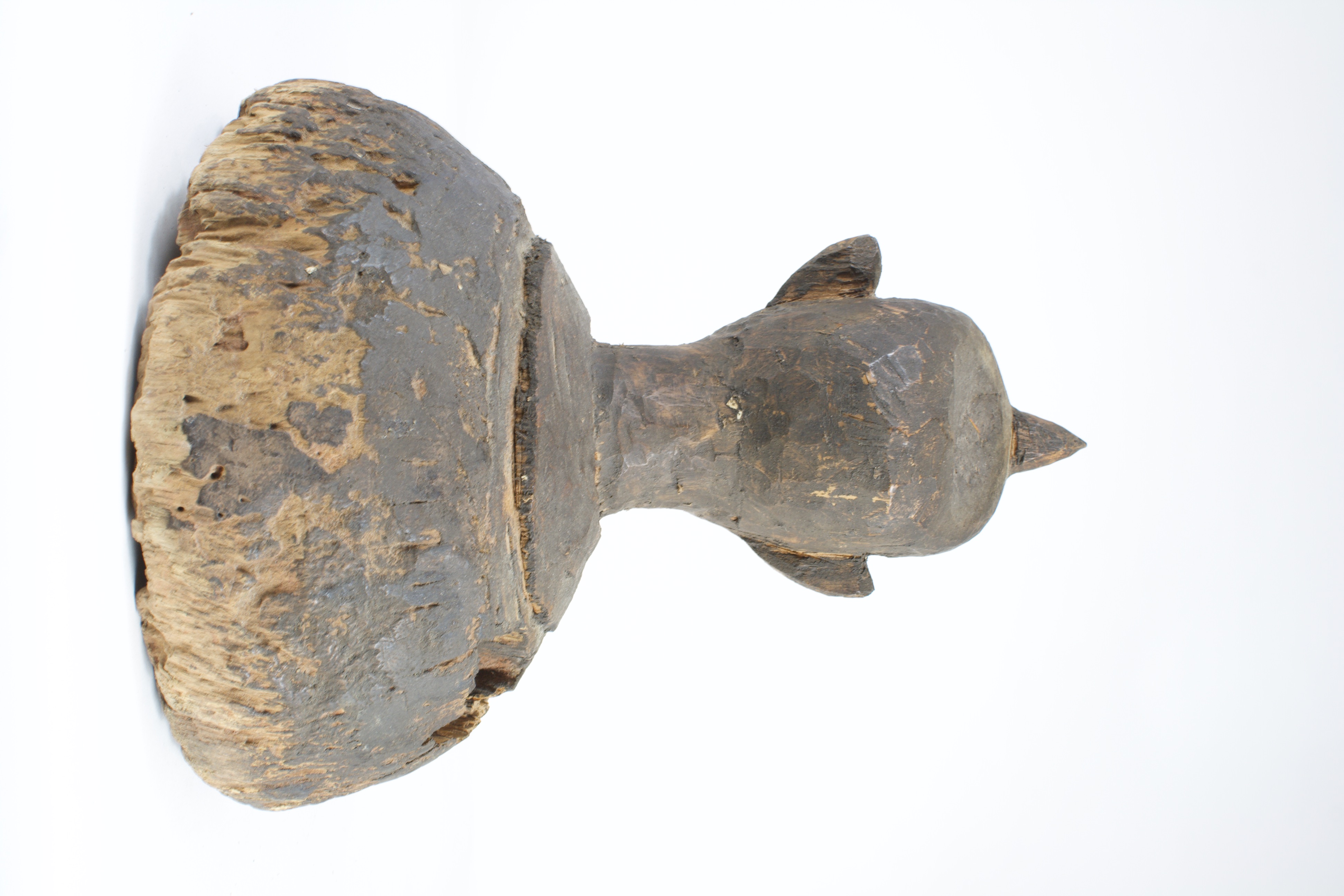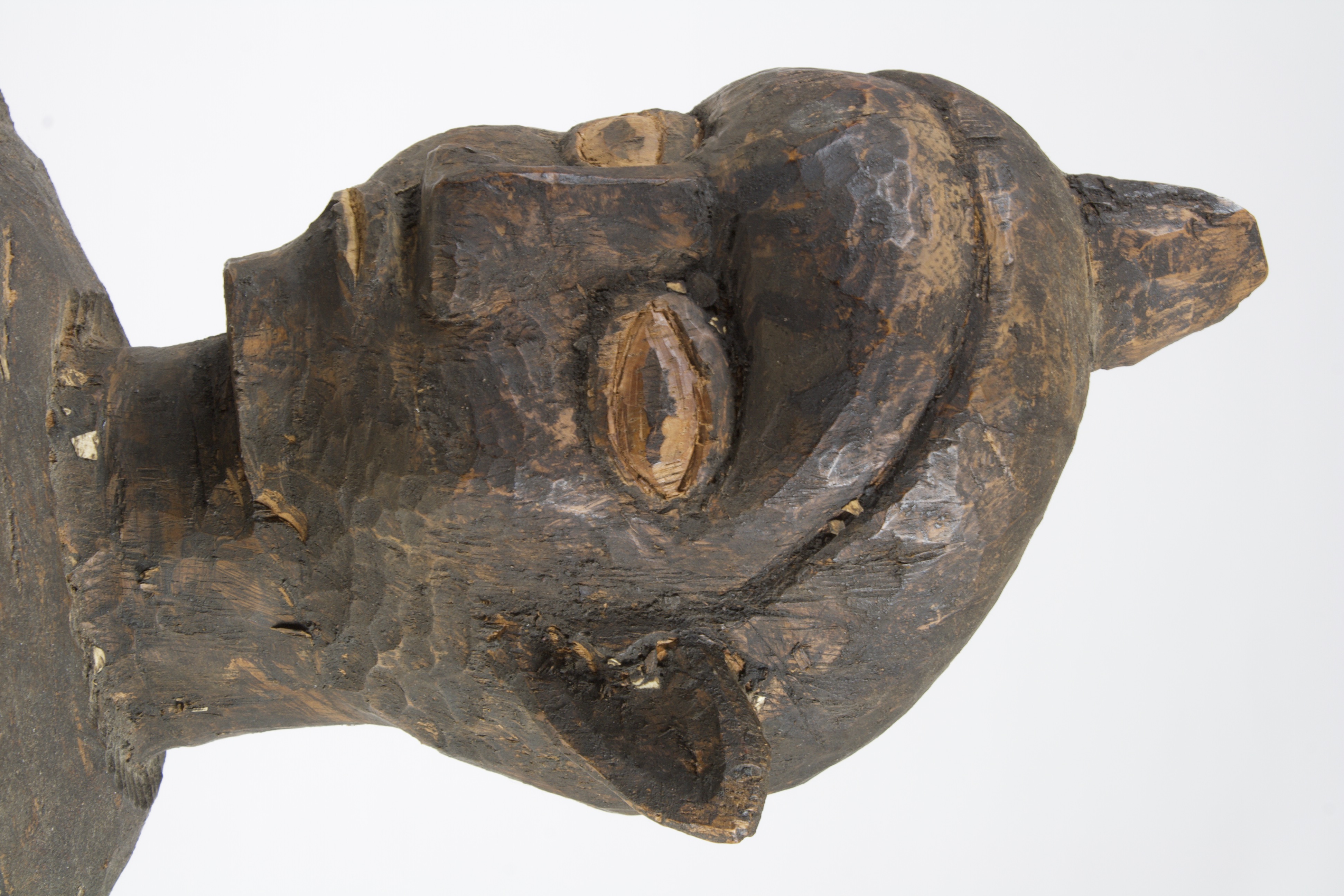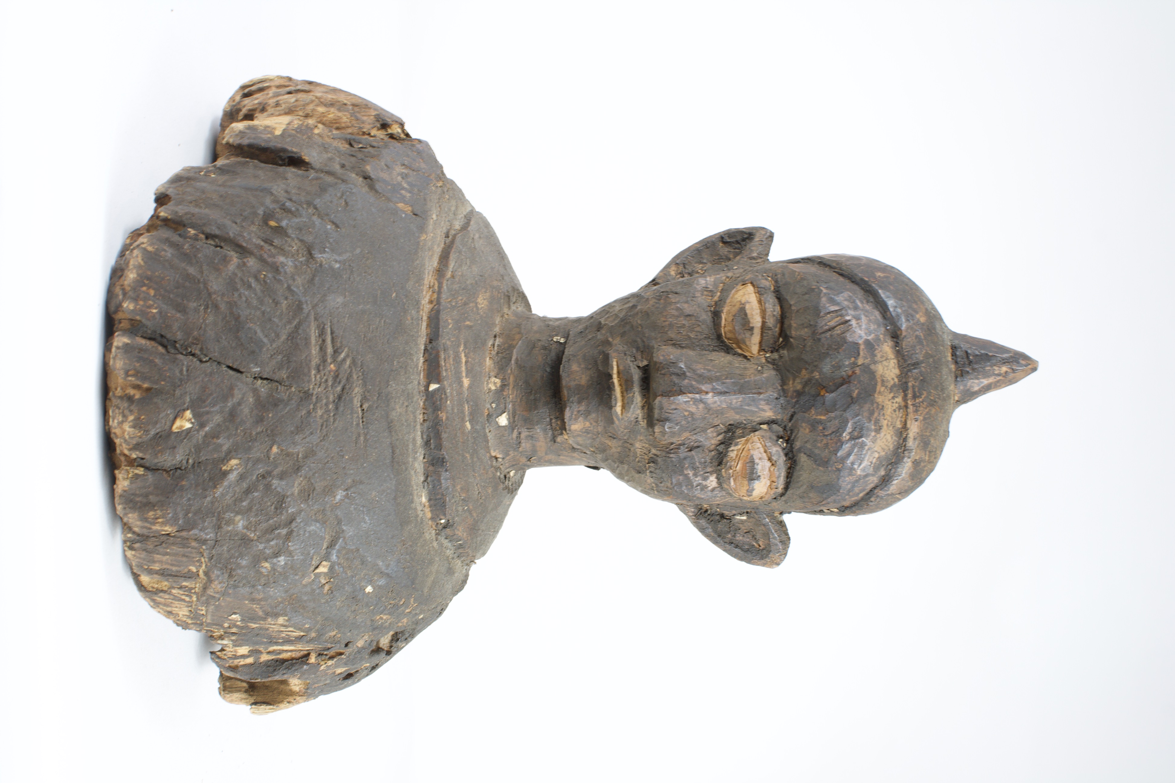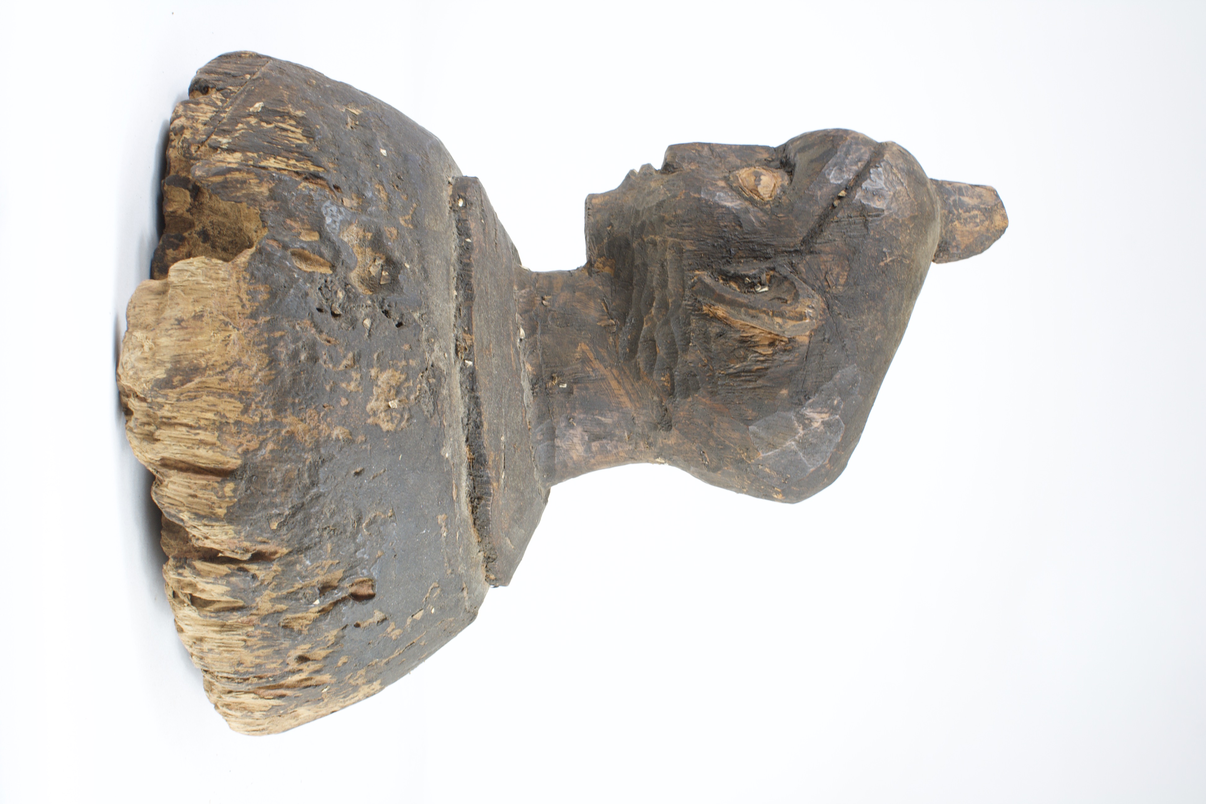 Carved wooden bust of a head, still attached to the original cut of wood. The head emerges from the wood, leaning forward with wide eyes. The eyes are patinated a lighter pigment than the rest of the wood, with thin lines marking the pupils. The facial features are carved at a low relief, remaining close to the face. A horn-like shape protrudes from the top of the head along the simplified coiffure. The top of the head is concave, with a small crack and hole in the center.