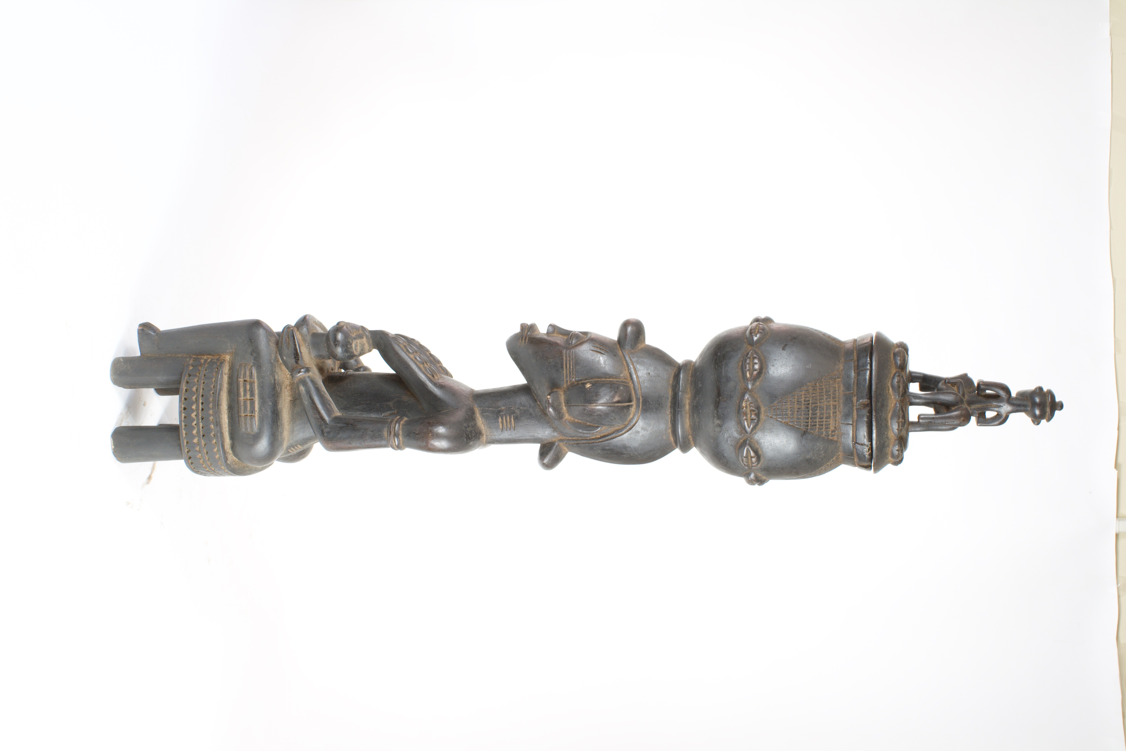 A sculpture depicts a seated maternity receptacle with a lid that features an equestrian figure. A seated female figure shows various scarifications on her breasts, where a baby is suckling to sustain his vitality. A line of a conch shell decorates the surface of a receptacle vessel. All these detailed elements are symbols of fertility. Although Senufo society is patriarchal, inheritance passes through the matrilineal line. The importance of maternity is generally reflected in the sculpture's content.