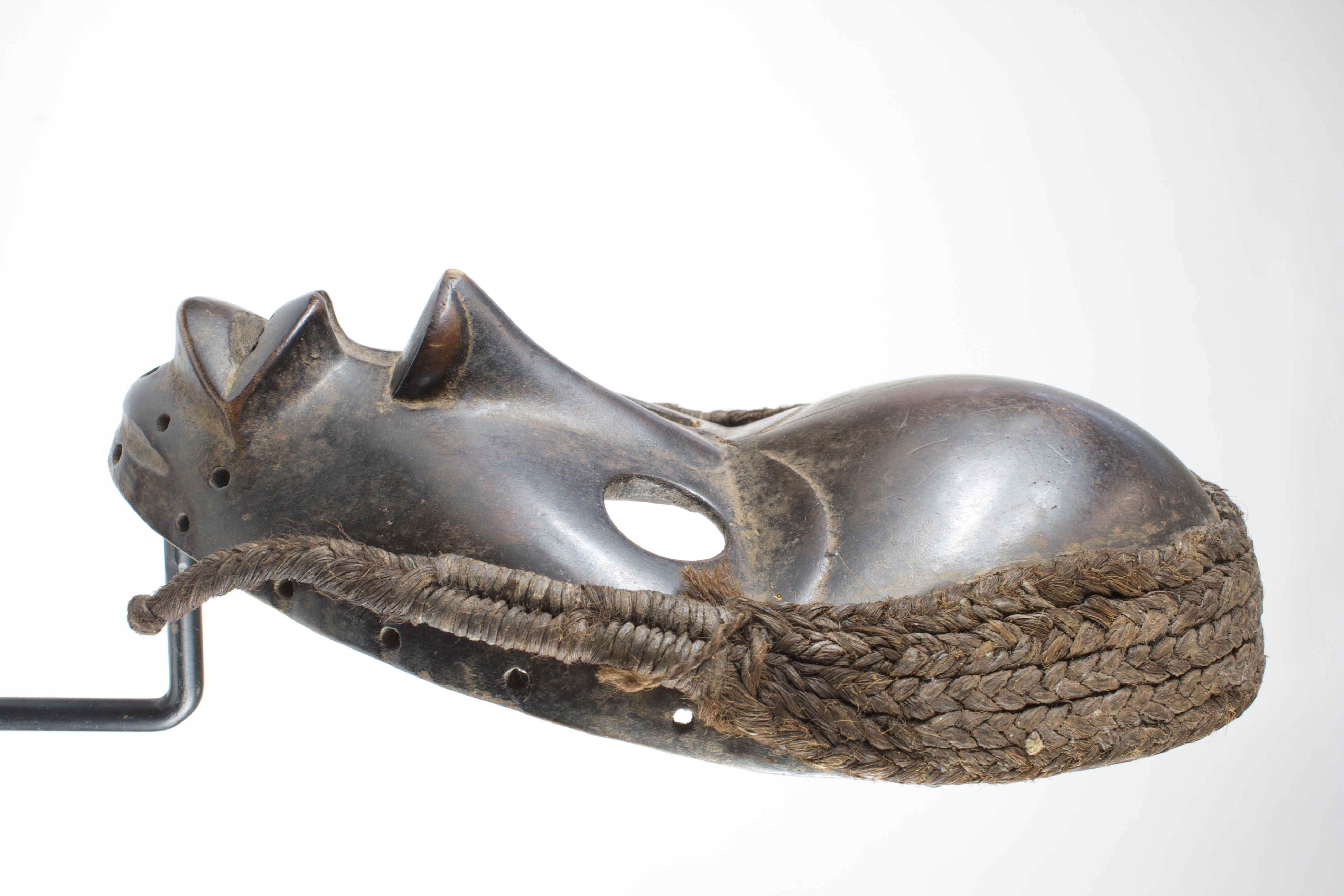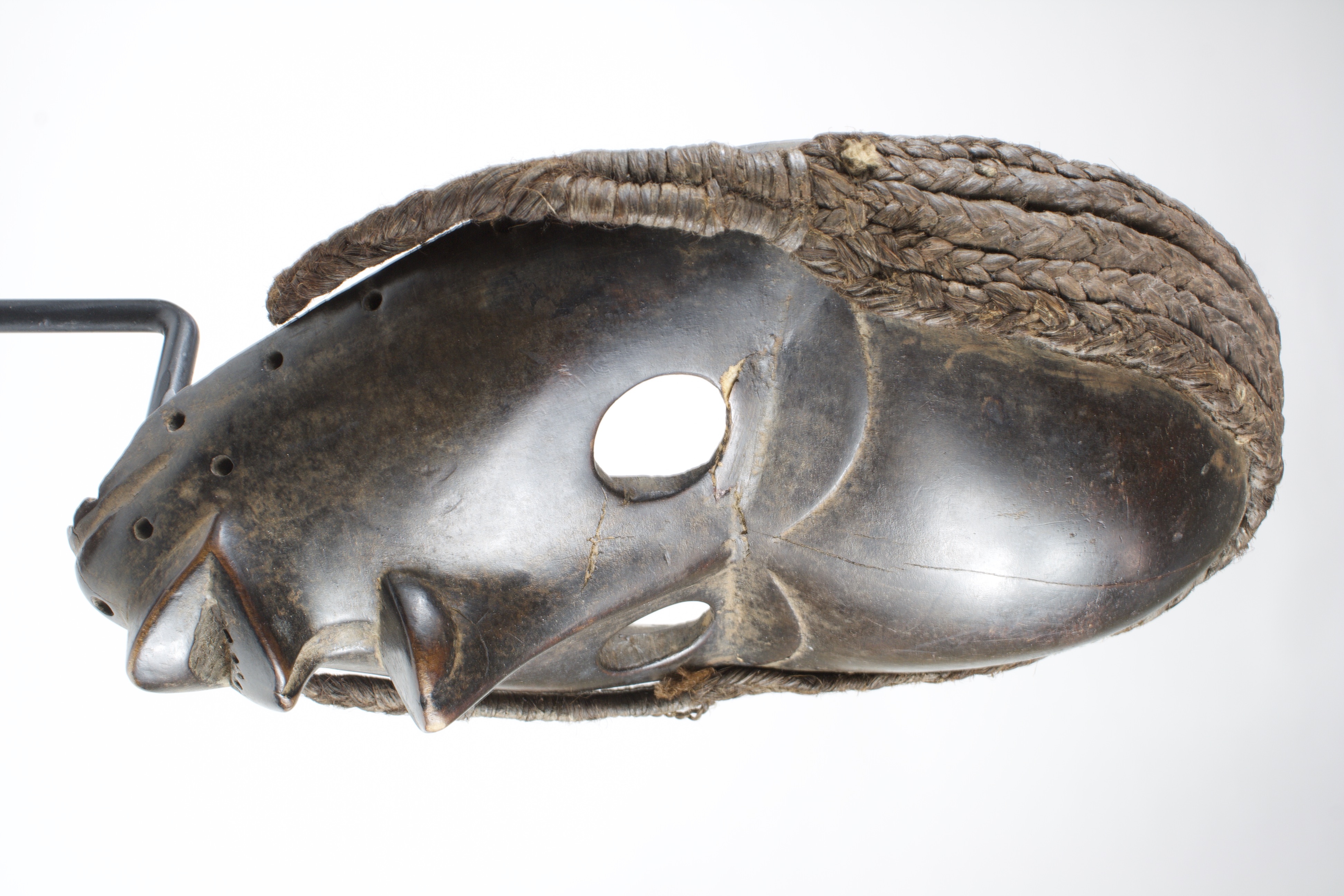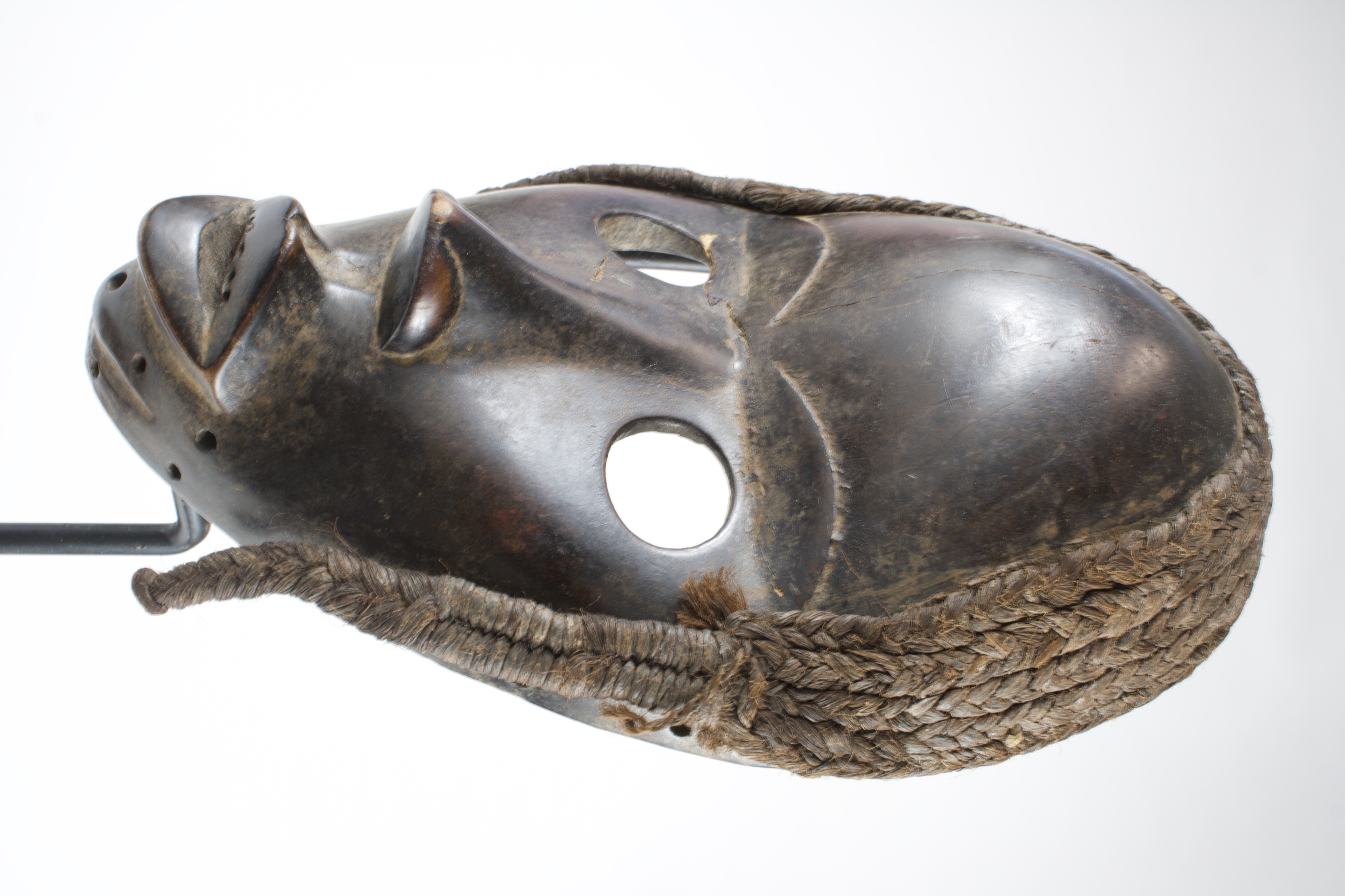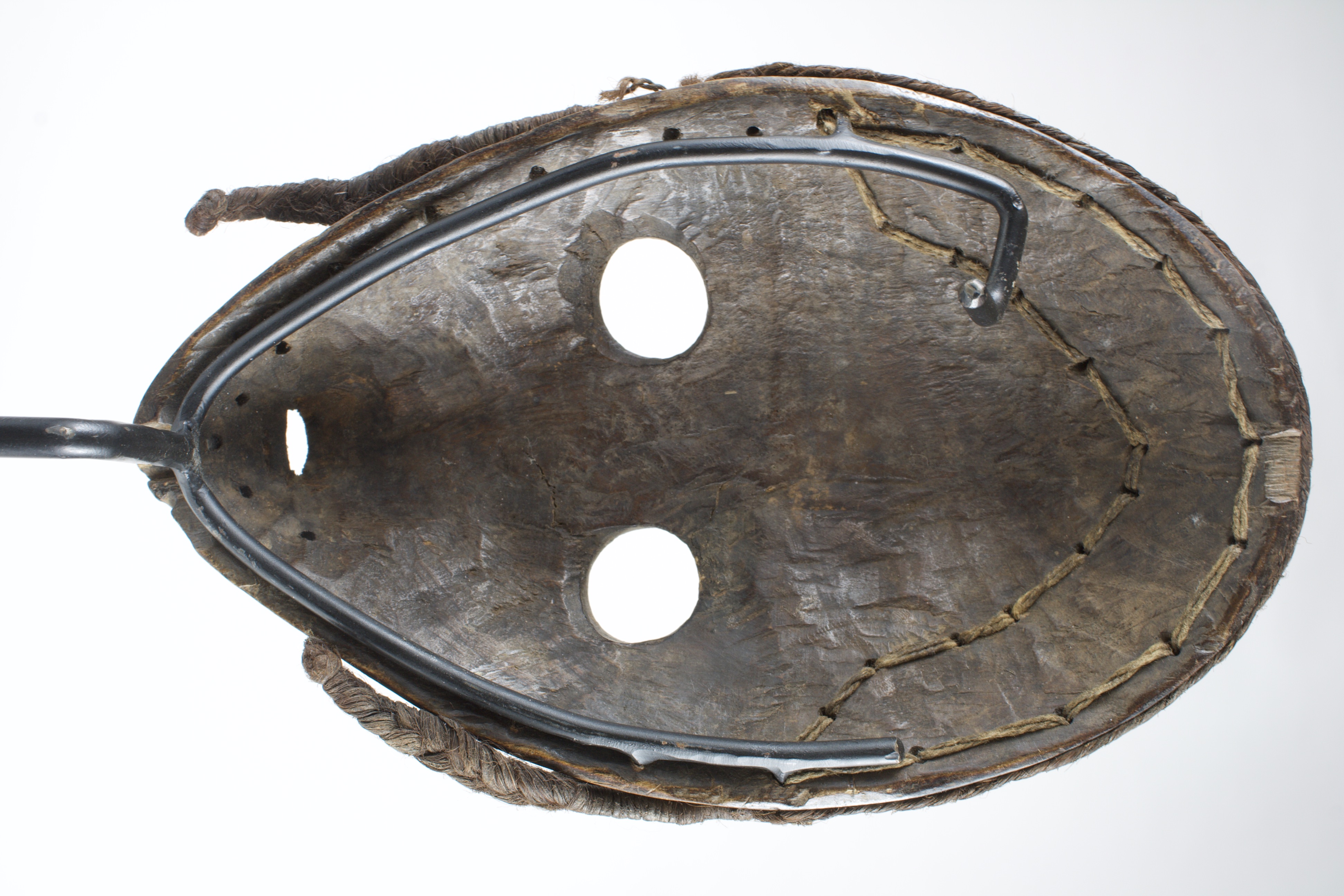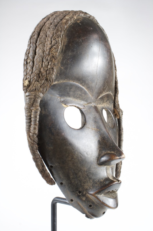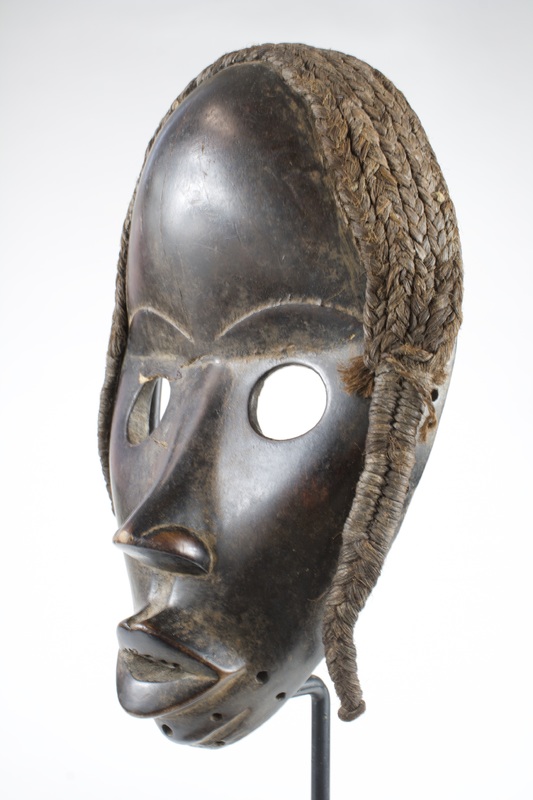 The wooden Dan mask has a large, bulbous forehead that moves downward to a narrow chin. The eyes are formed by large carved circles, which may identify this mask as a Gunye Ge mask used in foot racing competitions to be worn by the champion. Human hair has been braided and threaded through the small holes along the edge at the top of the mask. Similar small holes can be seen on the chin, potentially used to attach other facial hair or adornments.