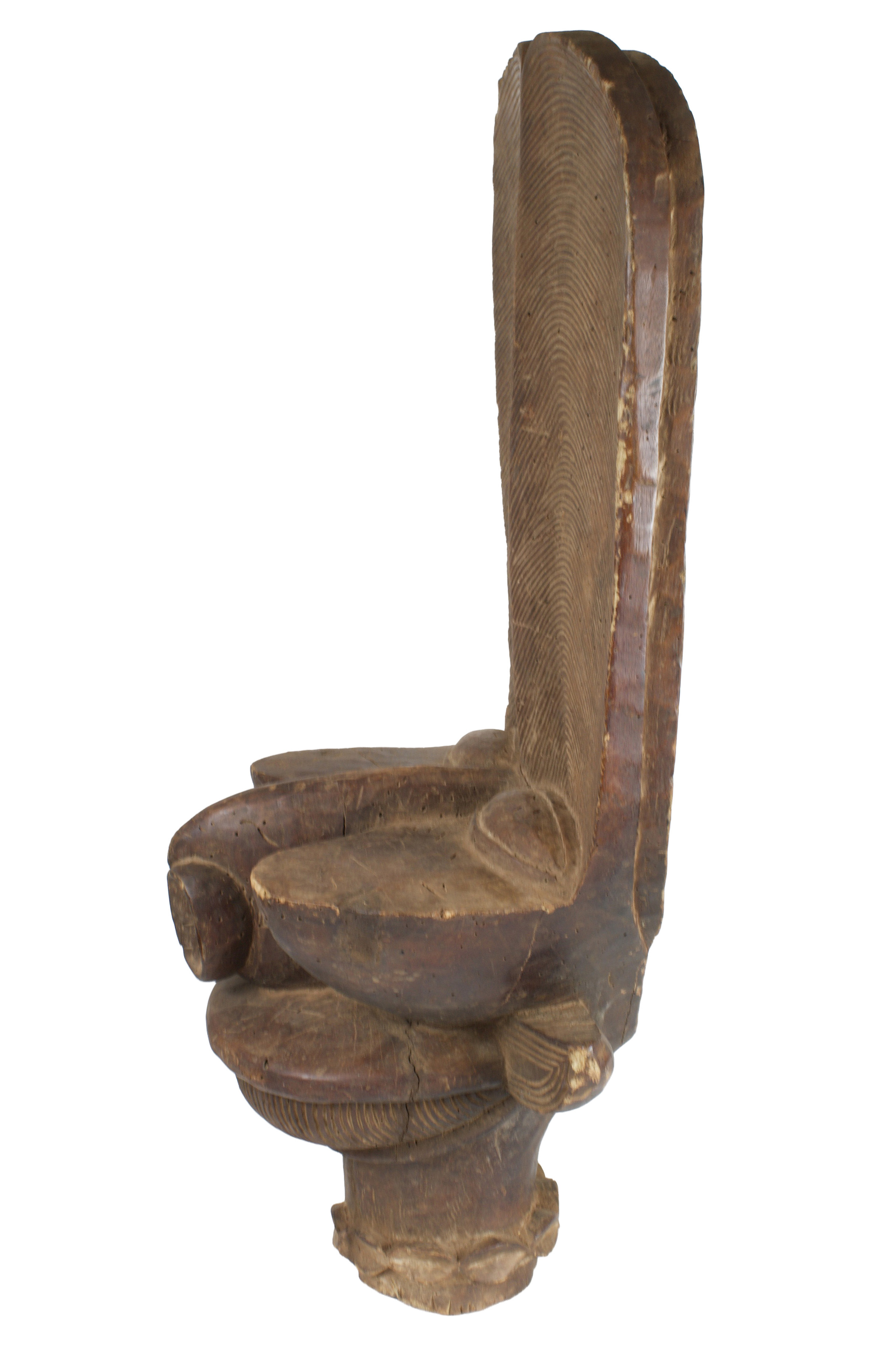The large batcham mask is carved of wood with incised lines detailing patterns along the vertical panel on the crest. Eyes bulge forward on either side of a wide, long nose with flared nostrils. The mouth is large and rounded with thin vertical lines. Seen from the back of the mask is a hollow round cavity. The mask was to be displayed during funerary ceremonies or the appointment of a new chief.