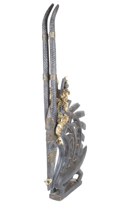 The headress resembles the form of an antelope, pangolin, and aardvark referring to the mythic Ci-Wara figure. Ci-Wara is believed to have introduced humans to the practice of agriculture. During ceremonies celebrating the skills of successful farmers, two headdresses, one male and one female, are worn. The inclusion of both male and female Ci-Wara headdresses symbolizes the unity between men and women as a key part in maintaining a strong community. This headress depicts the female figure with a smaller, child figure standing on its back. The headress is carved of wood, and has small metal bells that would have chimed during the performances. Cowrie shells and small pieces of fabric adorn the figures faces. Both faces are highly detailed and narrow. The bodies are more simplistic and rest on short legs. The mother and child figure create an interesting play of positive and negative space through their silhouette forms.