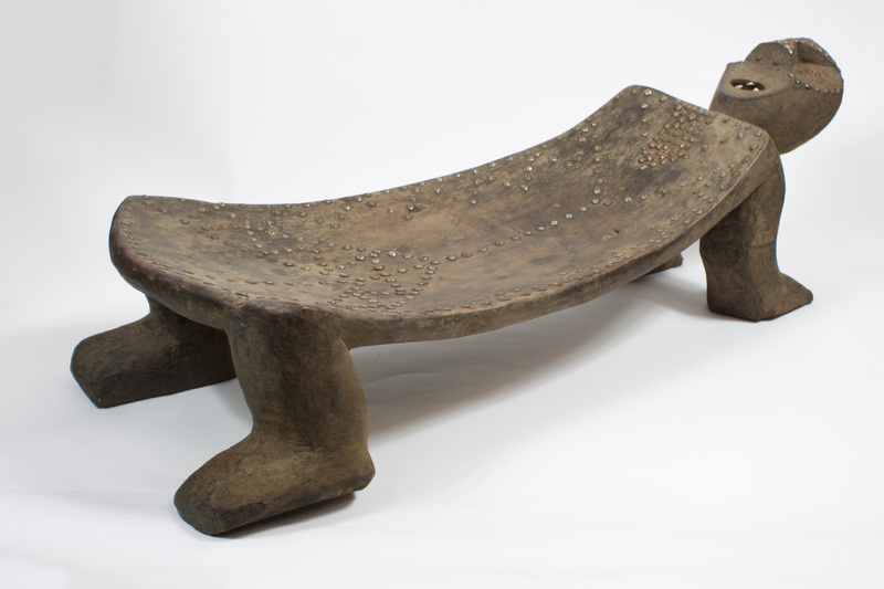 The wooden bed depicts an elongated human figure, standing on all fours with its chest facing upwards. Metal pins across the face and abdomen detail both facial features and scarification patterns. Animal teeth have been inlaid into the mouth. The bed was most likely used for decorative purposes, not for much physical use as there is a lack of scratching or markings made on the surface.