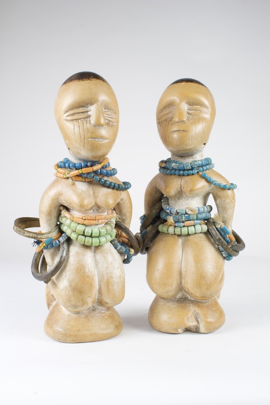 The wooden carved female twin figures are highly decorated with dark pigments, glass beads and metal jewelry. The bodies are rounded, kneeling with their arms at their sides. The eyes are closed with thinly incised lines marking the eyelids. Scarification patterns run vertically up and down the cheeks. Twin figures were created to commemorate either one child or the set of twins after death. Twins are believed to have spiritual powers in communities of Nigeria like Yoruba, thus memorial figures were often created.