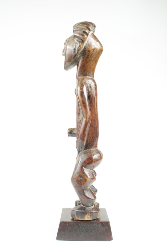 The standing male figure is carved of wood with a dark patina. The head is proportionately larger than the body and topped with a stylized coiffure. Ears have been carved on either side of the head in line with bulging eyes and a centered nose. The mouth is square in juxtaposition with the rounded forms of the other features. Above the eyes on the brow ridge are small holes indicating scarification patterns. Arms reach downward towards thicker, short legs. The abdomen is long and narrow, with carved breasts and male genitalia, along with a protruding navel.